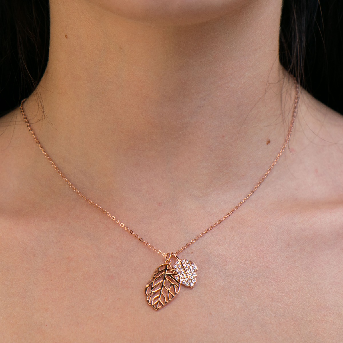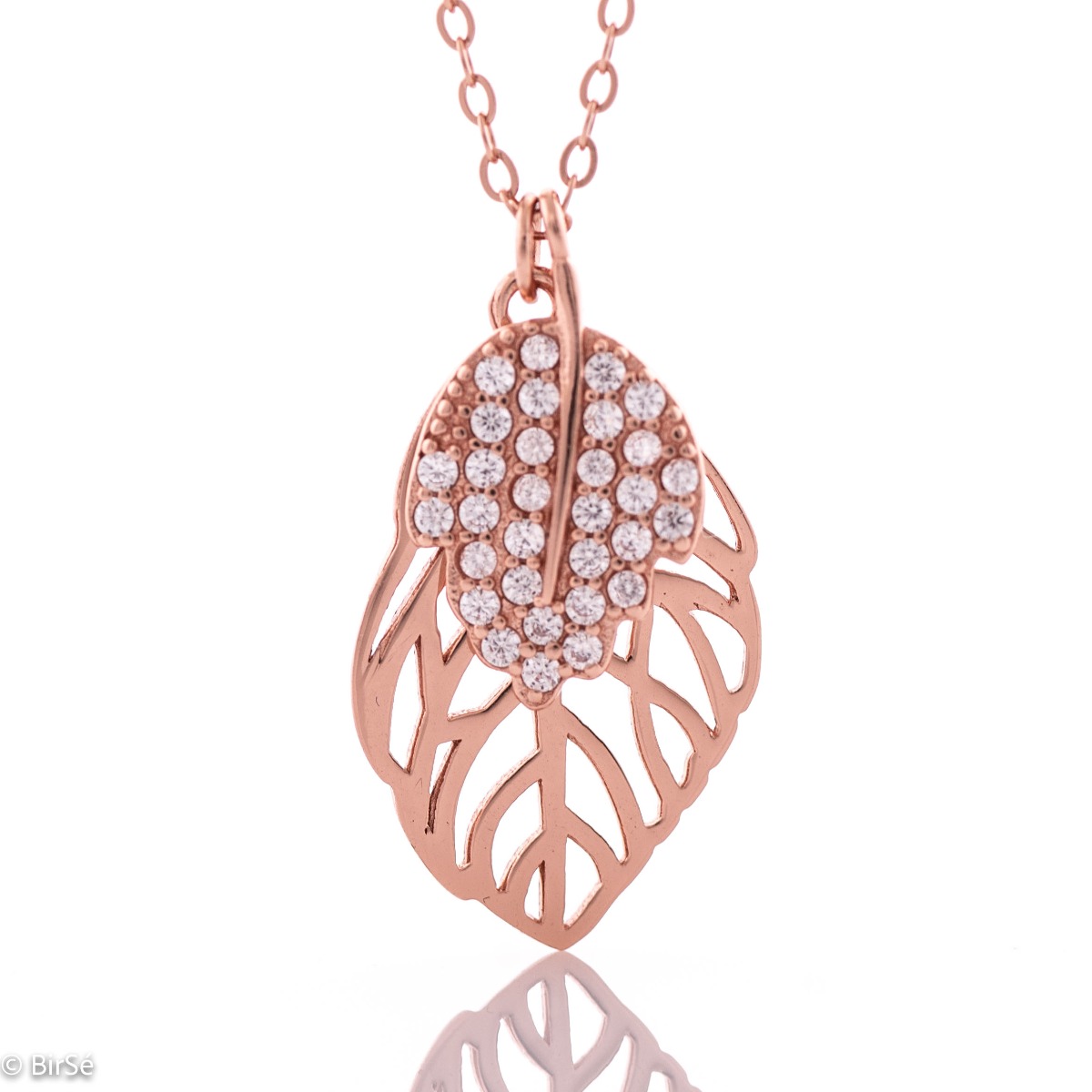 Изключително фина и деликатна изработка на колие от нежно родирано розово сребро с форма на листа. Стилно оформление на детайлите с добавка на бляскави бели циркони.