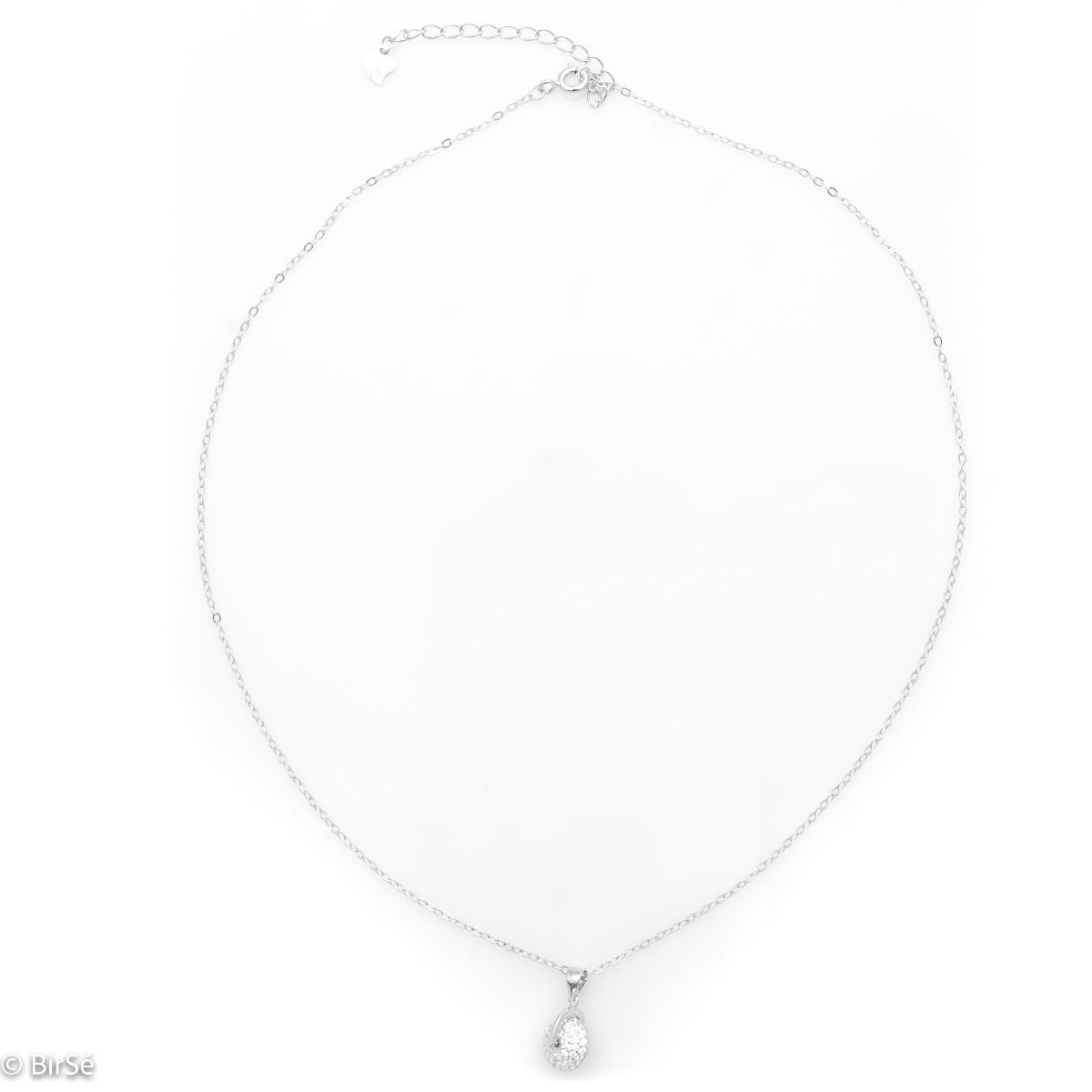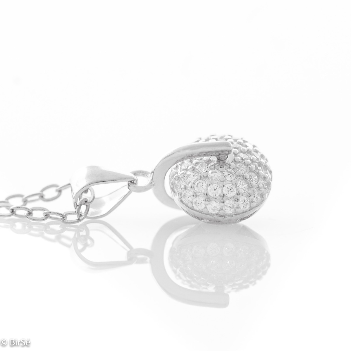 Екстравагантно колие от класическо сребро с интересен въртящ се елемент, наподобяващ колело. Обилно украсен с бляскащи циркони, той придава очарование на бижуто и красиви отблясъци при среща със слънцето.