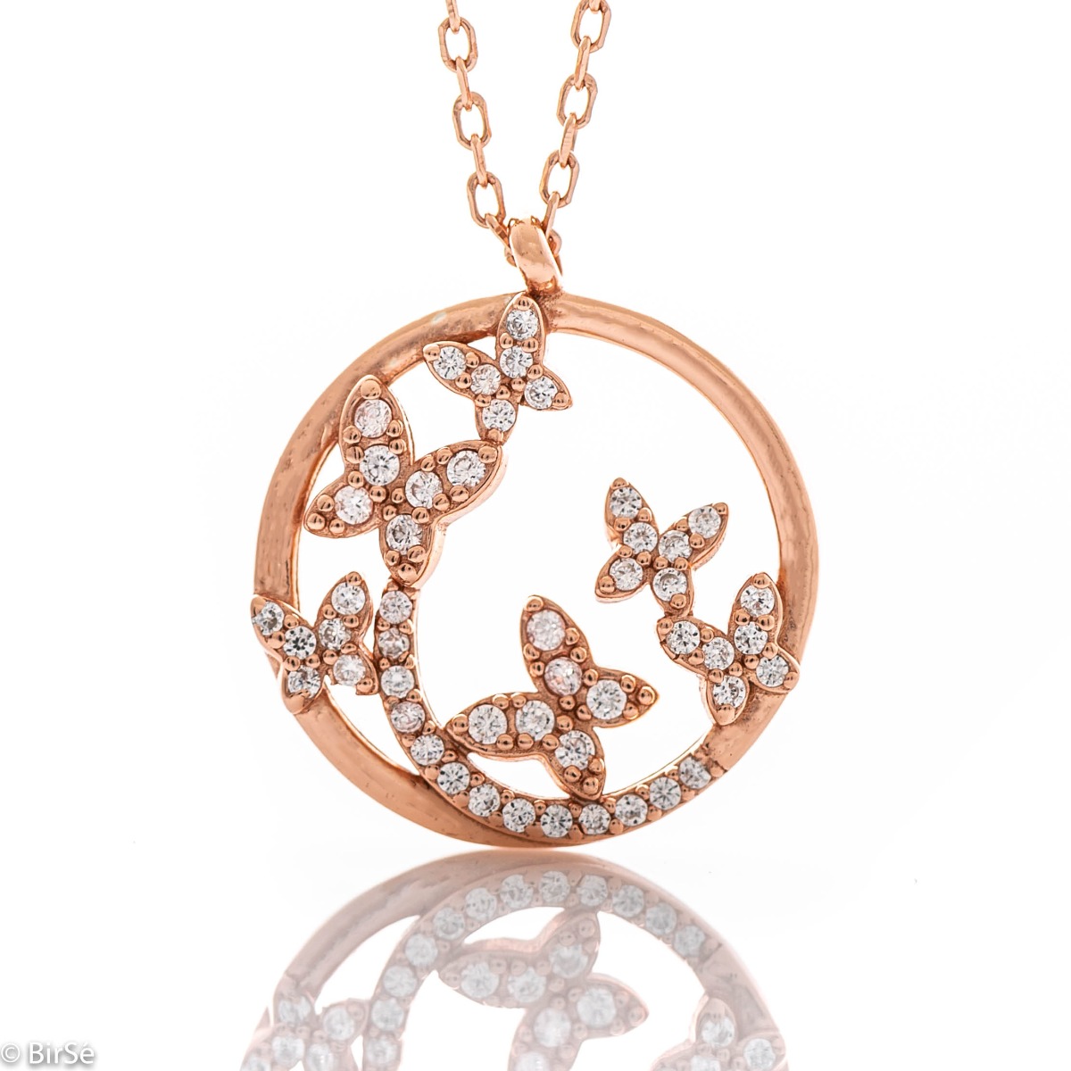 Изящно колие от красиво розово сребро с рояк прелестни пеперуди, изцяло обсипани с циркони. Ефектно и много стилно, колието е подходящ подарък за всяка дама.
