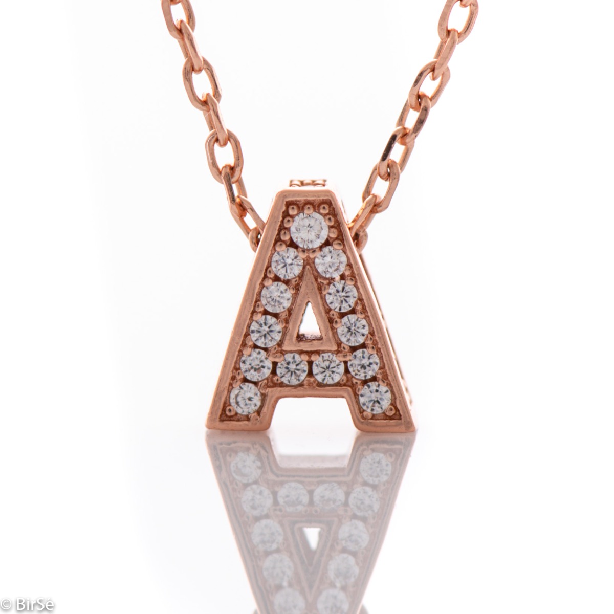 Изтънчена изработка на дамско колие от розово сребро с буква А, цялата покрита с бляскави циркони. Атрактивно бижу, в което нежната красота на розовото сребро умело е съчетана с блясъка на цирконите.