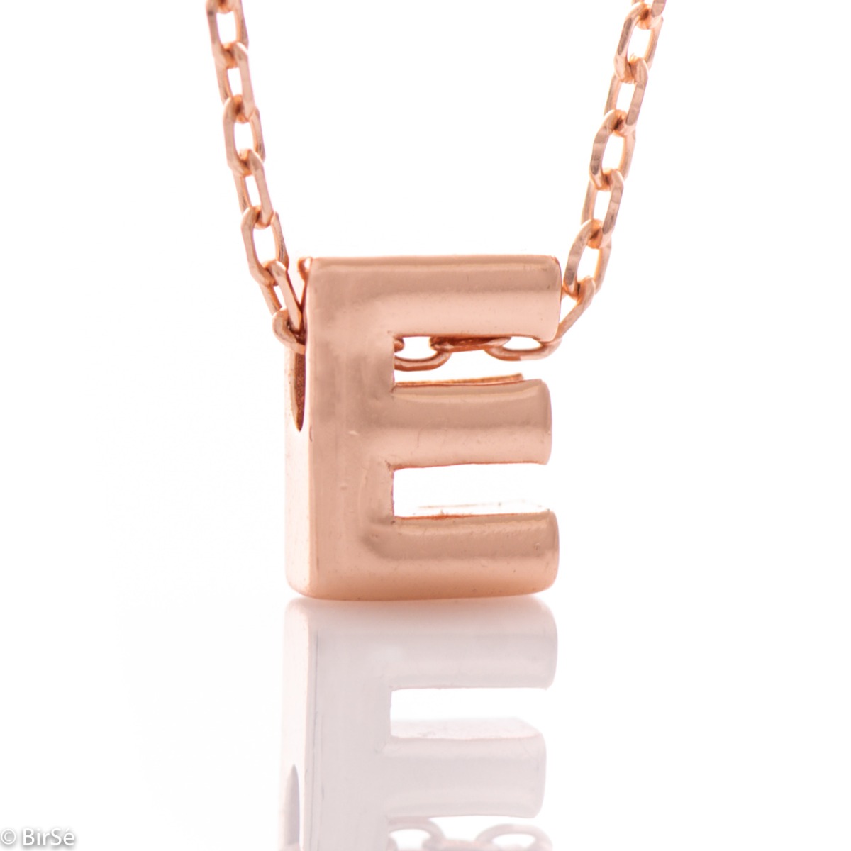 Изтънчена изработка на дамско колие от розово сребро с буква Е. Нежно и ефектно бижу, семпло и умело съчетаващо се с всякакви бижута от розово сребро.