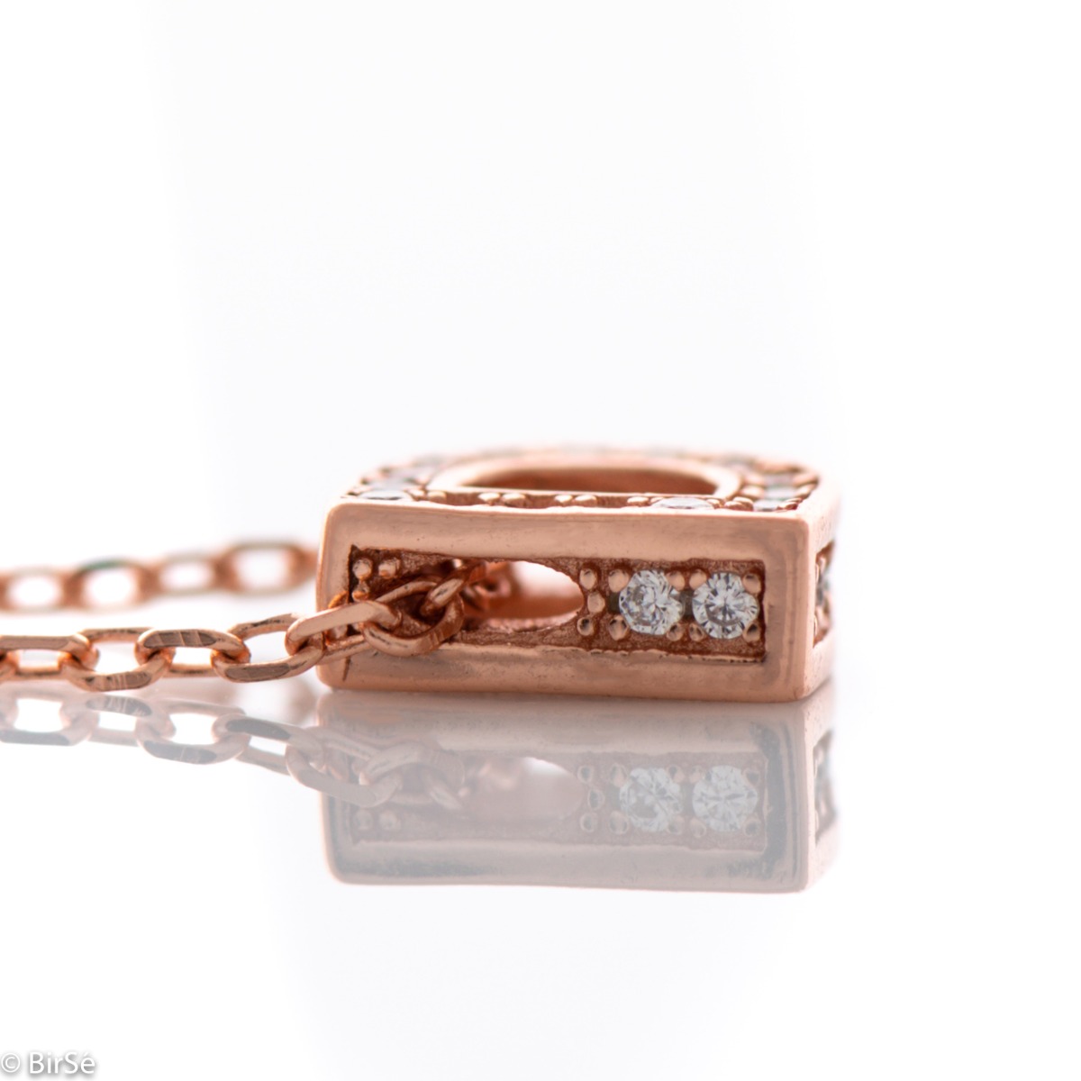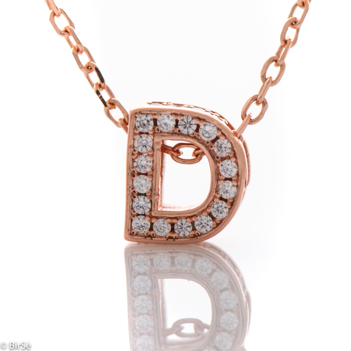Изтънчена изработка на дамско колие от розово сребро с буква D, цялата покрита с бляскави циркони. Атрактивно бижу, в което нежната красота на розовото сребро умело е съчетана с блясъка на цирконите.