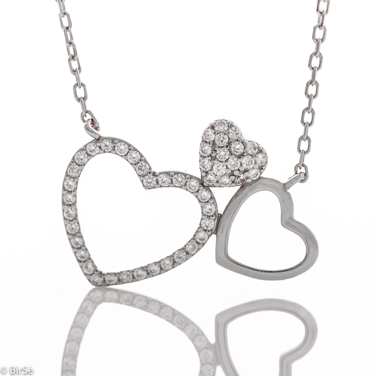 Нежно дамско колие с фини преплетени сърчица и изящна изработка изцяло от родирано сребро, допълнено от бляскави циркони.