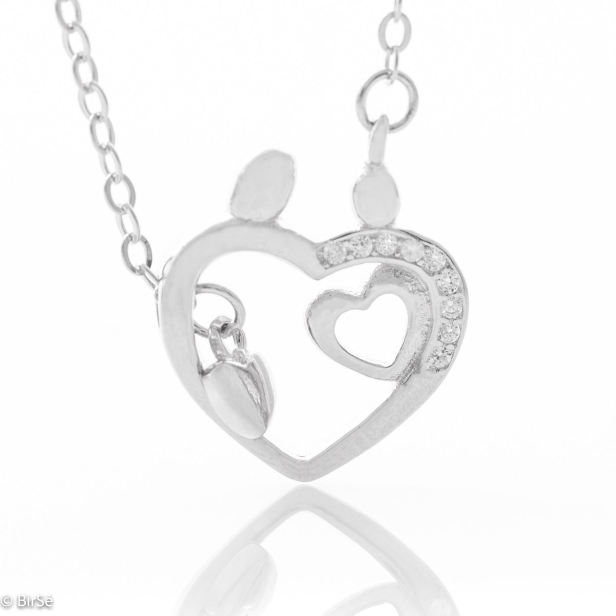 Интересна изработка на колие от родирано нежно сребро с форма на сърце и подобна висулка, поставена в края на регулируема верижка. Закачливо бижу за Вашето ежедневие.