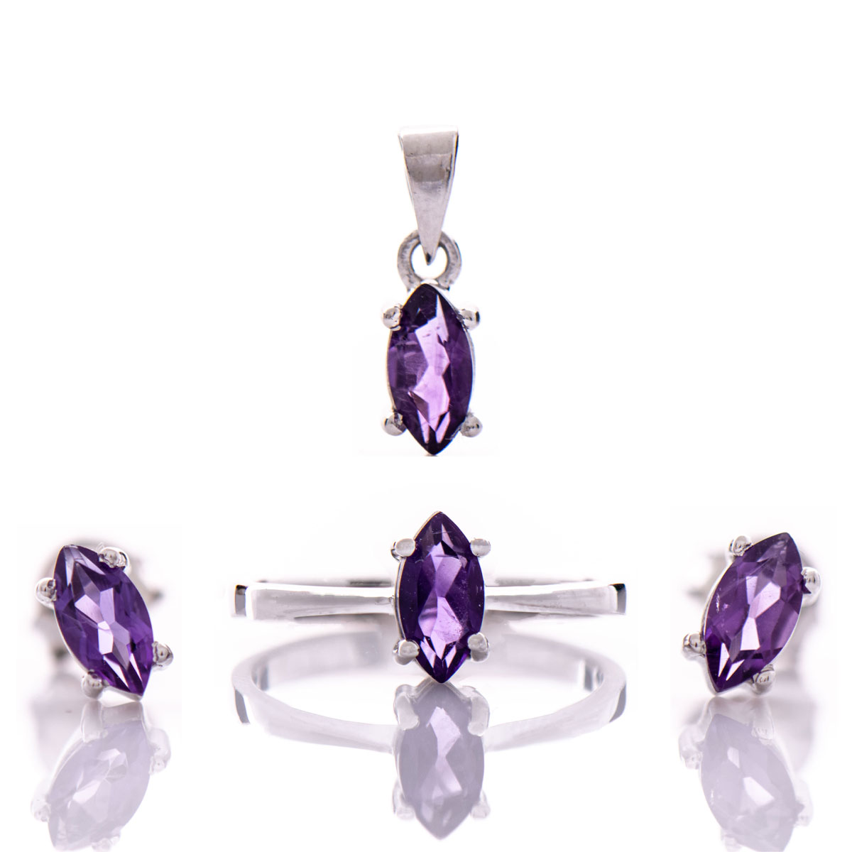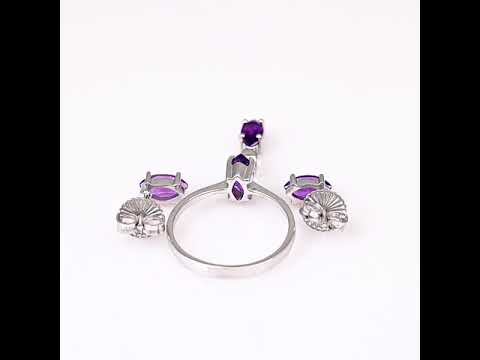Невероятен дамски комплект от три части, включващ ослепителен пръстен, обеци на щифт и висулка. Нежна изработка и уникално съчетание на родирано сребро с естествен камък аметист.Всички бижута с естествени камъни са придружени от специален сертификат, удостоверяващ автентичността им. На този сертификат можем да изпишем и лично послание за Вас или за когото е бижуто. Вижте още информация тук.