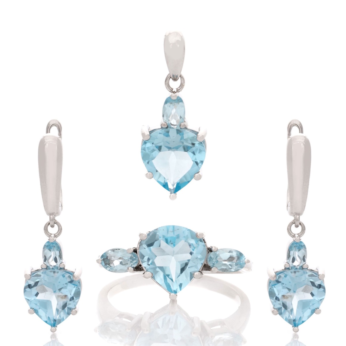 Изкусителен дамски комплект от нежно родирано сребро с елегантен висящ модел обеци, ефектен пръстен и изящна висулка. Пленителни камъни естествен син топаз с форма на капка са в основата на бижутата. Обеците са с прецизно английско закопчаване. Всички бижута с естествени камъни са придружени от специален сертификат, удостоверяващ автентичността им. На този сертификат можем да изпишем и лично послание за Вас или за когото е бижуто. Вижте още информация тук.