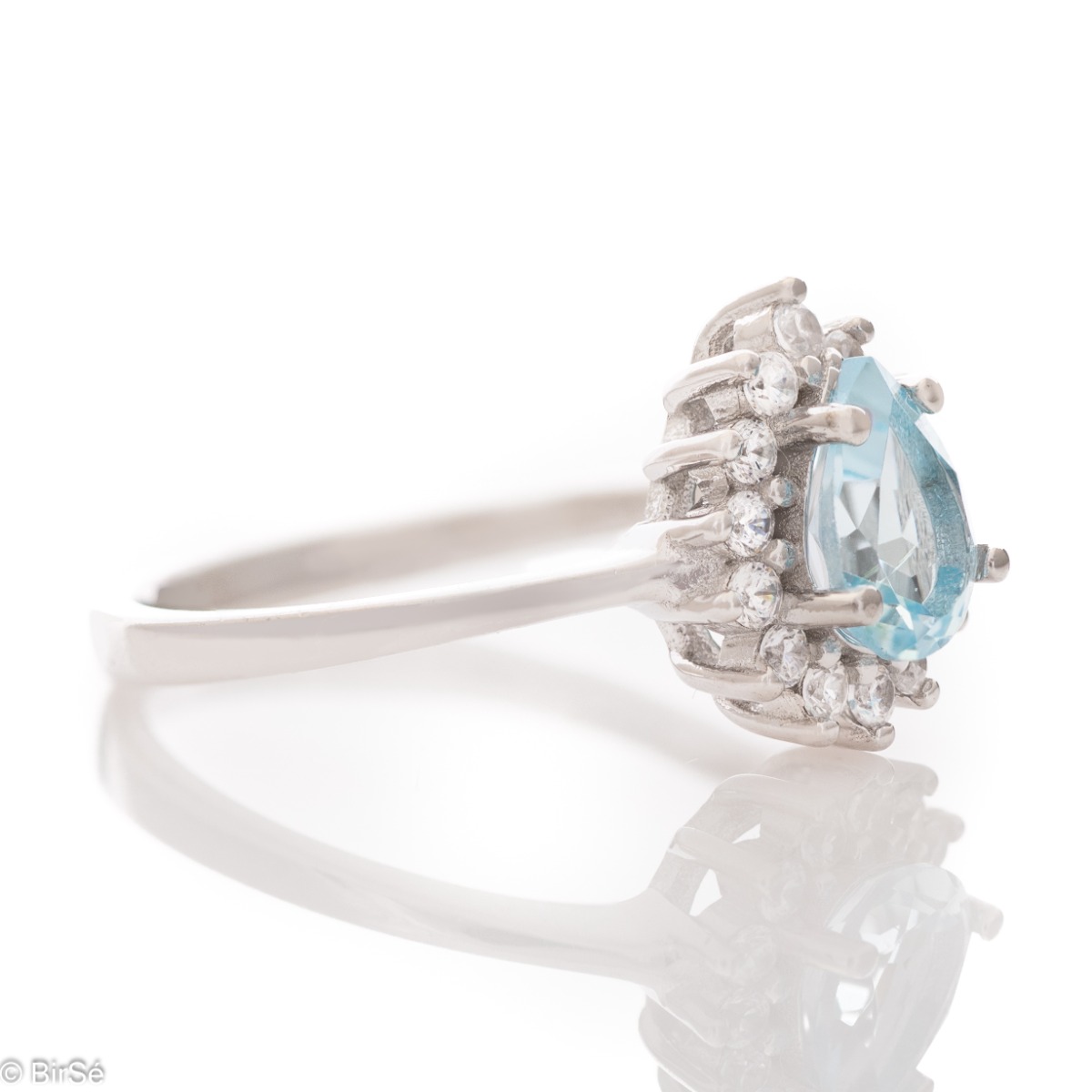 Елегантен сребърен пръстен с капковидна форма и естествен син топаз, обгърнат от бляскави циркони. Подходящ за всеки специален момент на всяка дама, особено в комбинация с обеци и висулка от същата неповторима колекция. Всички бижута с естествени камъни са придружени от специален сертификат, удостоверяващ автентичността им. На този сертификат можем да изпишем и лично послание за Вас или за когото е бижуто. Вижте още информация тук.