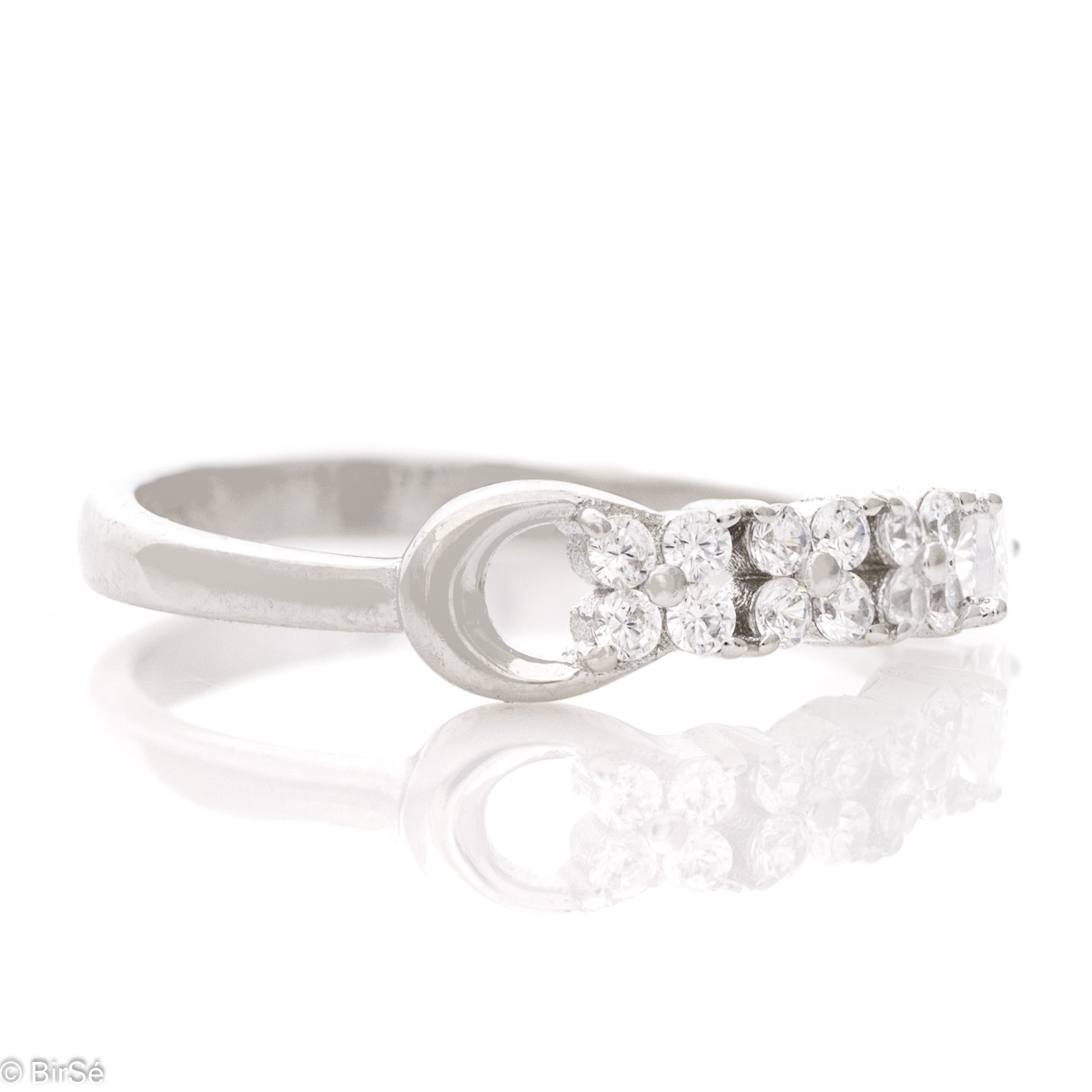 Елегантен дамски пръстен с изящна изработка от родирано сребро и сияйни циркони. Може да се комплектова с обеци на щифт от модела.