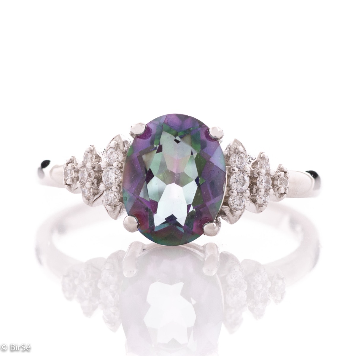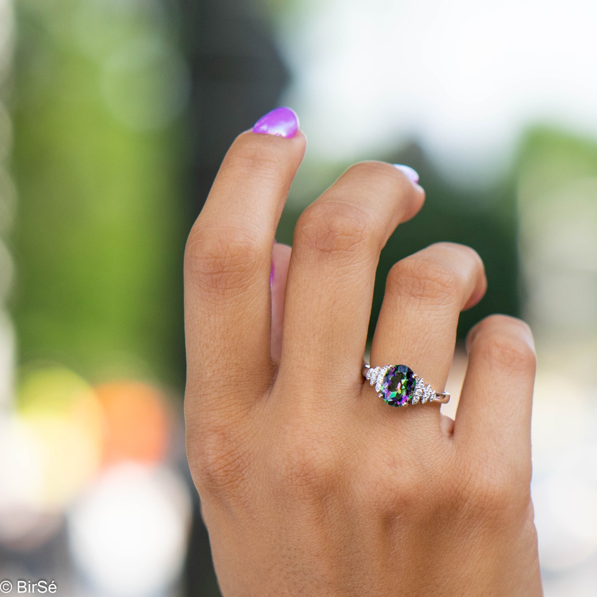 Изящен дамски пръстен с прецизна изработка изцяло от бляскаво родирано сребро и ефектна форма на ананасче от естествен камък мистик топаз с циркони. Всички бижута с естествени камъни са придружени от специален сертификат, удостоверяващ автентичността им. На този сертификат можем да изпишем и лично послание за Вас или за когото е бижуто. Вижте още информация тук.