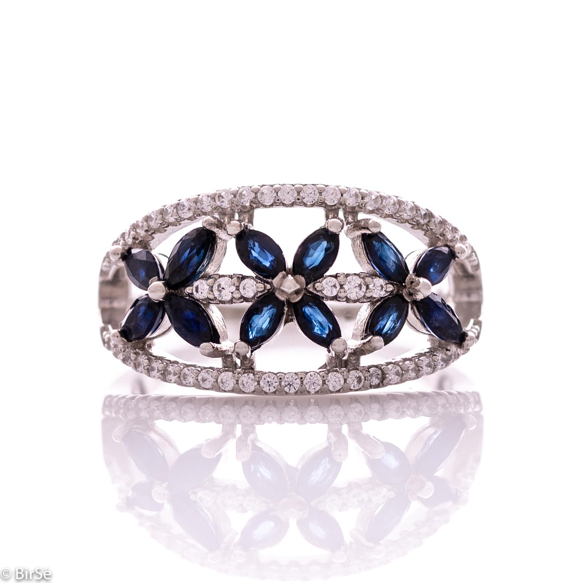 Изящен дамски пръстен с ефектна изработка изцяло от родирано сребро, съчетано с нежни цветенца от естествен сапфир и циркони. Може да се комбинира с обеци и висулка от същия модел. Всички бижута с естествени камъни са придружени от специален сертификат, удостоверяващ автентичността им. На този сертификат можем да изпишем и лично послание за Вас или за когото е бижуто. Вижте още информация тук.