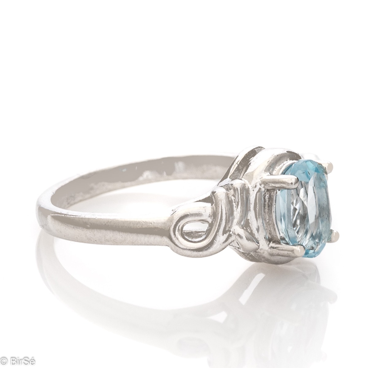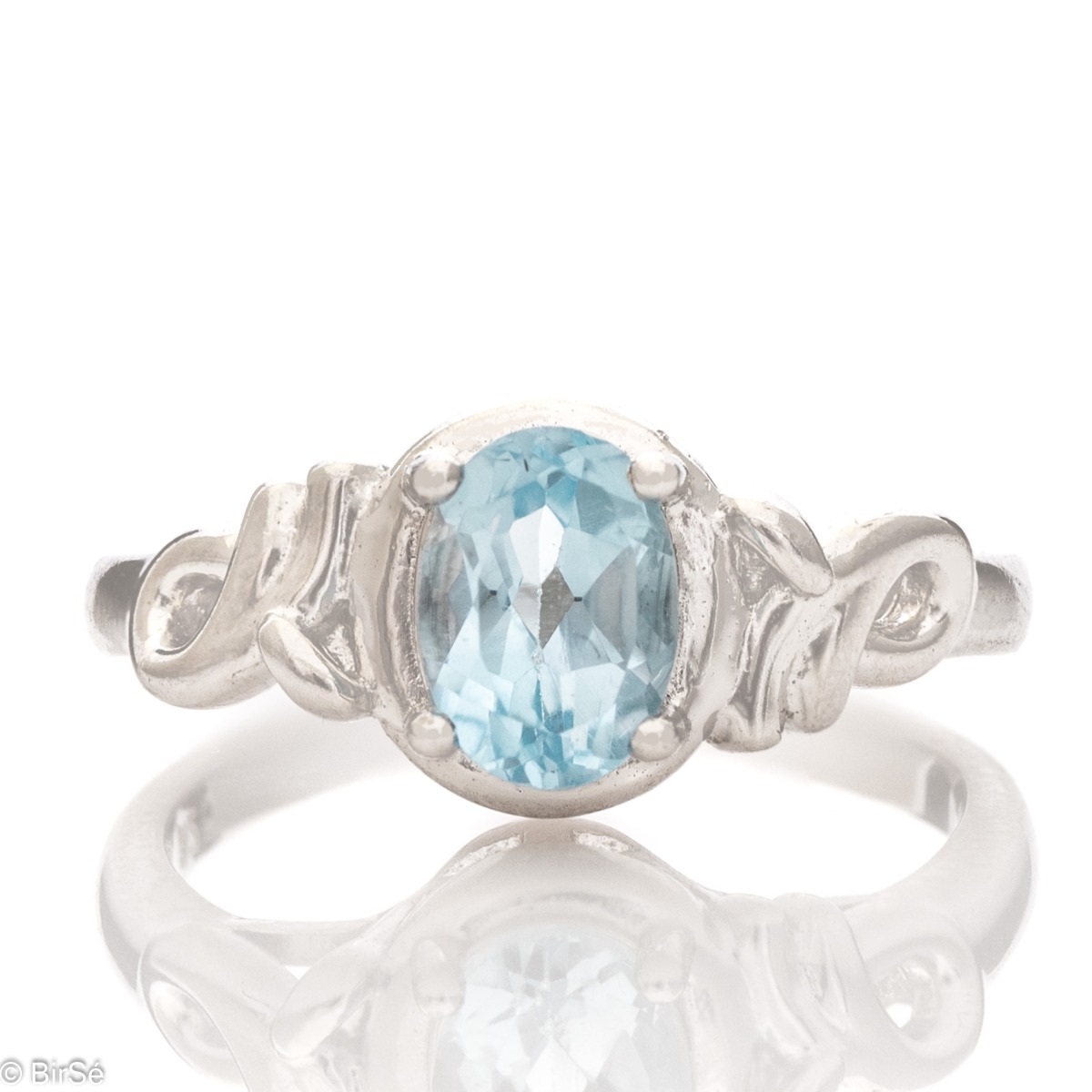 Бижу с изящна красота откриваме в пръстен от родирано сребро и овален камък син топаз. Част от елегантен комплект с висулка и обеци с английско закопчаване. Всички бижута с естествени камъни са придружени от специален сертификат, удостоверяващ автентичността им. На този сертификат можем да изпишем и лично послание за Вас или за когото е бижуто. Вижте още информация тук.