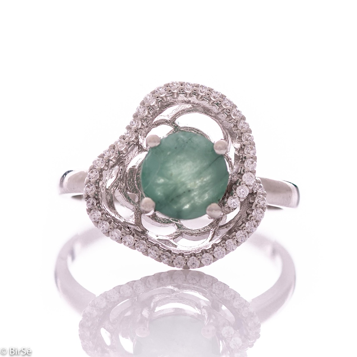 Изящен дамски пръстен с изключителна изработка съчетаваща сияен естествен изумруд с бляскави циркони и нежно родирано сребро. Може да се комбинира с обеци и висулка от същия модел. Всички бижута с естествени камъни са придружени от специален сертификат, удостоверяващ автентичността им. На този сертификат можем да изпишем и лично послание за Вас или за когото е бижуто. Вижте още информация тук.