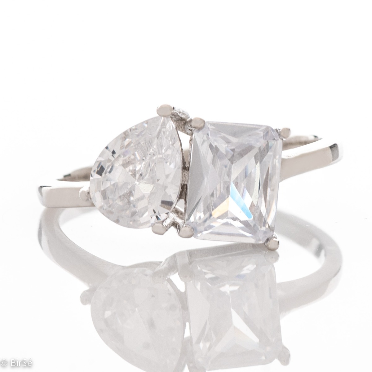 Бляскаво трио – невероятен дамски пръстен, изработен в интересна форма от съчетание на родирано сребро, капковиден циркон и ослепителен циркон с форма багет.