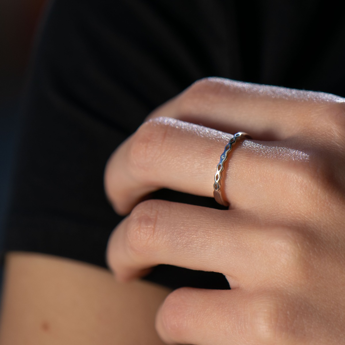 Нежна и ефирна изработка на пръстен от родирано сребро с елегантно оформени детайли, фини линии и мъничък бляскав циркон за финес. Пръстенът позволява да се носи в комбинация с няколко други пръстена от сребро.