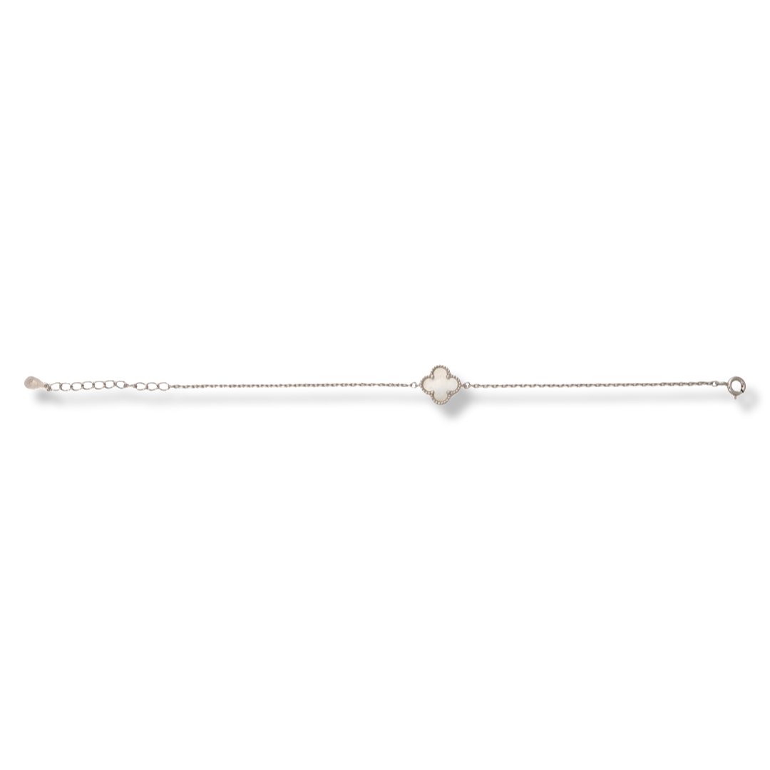 Изчистена и елегантна дамска гривна с регулируем размер и класическа плетка, изработена изцяло от родирано сребро, съчетано с изящно цвете от нежен седеф.