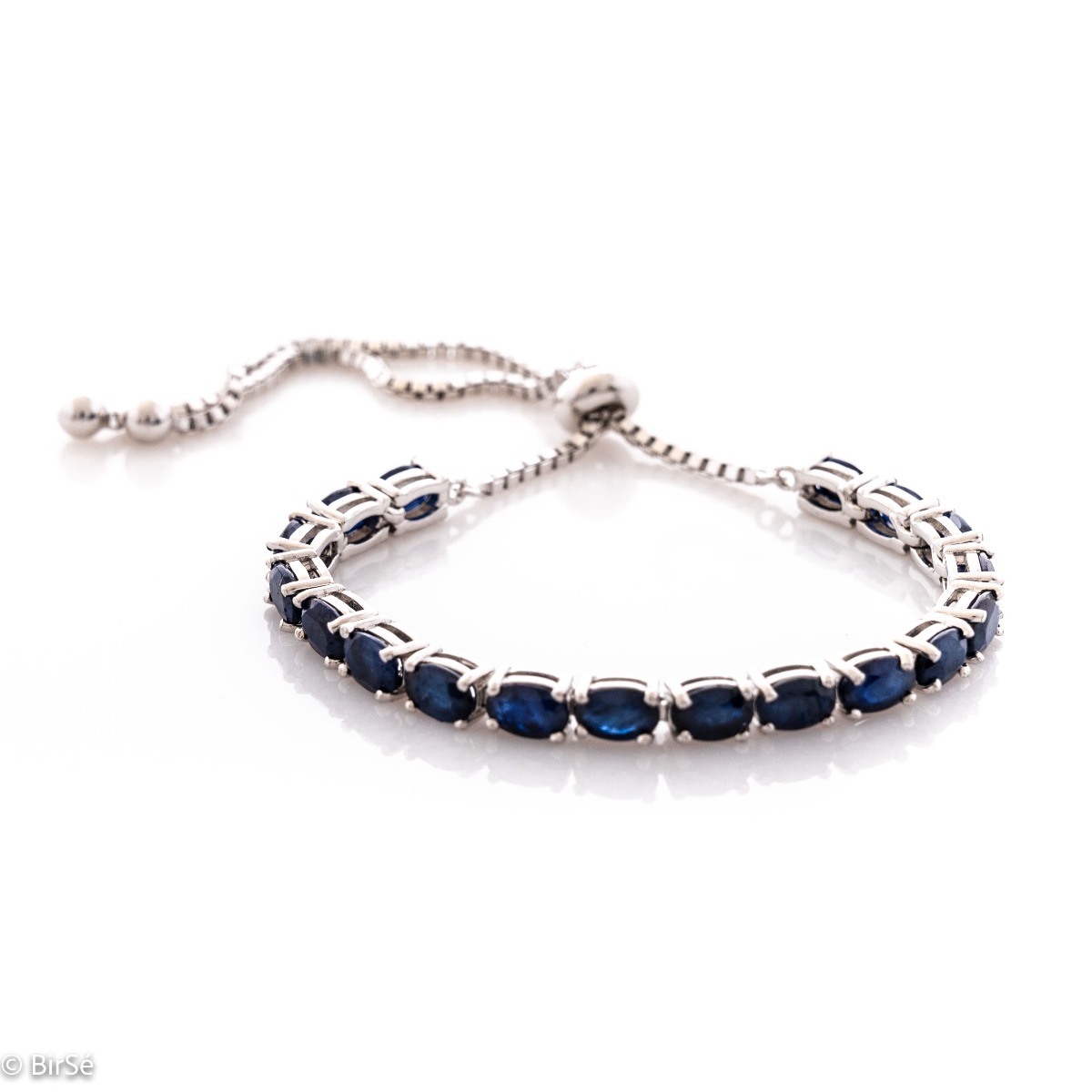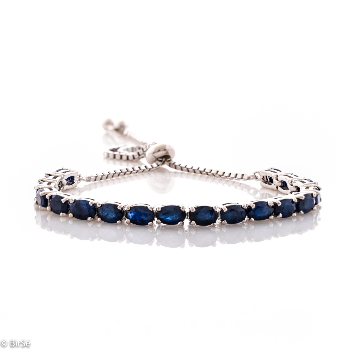 Изящна дамска гривна с мека и прецизна изработка, съчетаваща нежно родирано сребро с омагьосващи естествени камъни сапфир с овална форма. Всички бижута с естествени камъни са придружени от специален сертификат, удостоверяващ автентичността им. На този сертификат можем да изпишем и лично послание за Вас или за когото е бижуто. Вижте още информация тук.