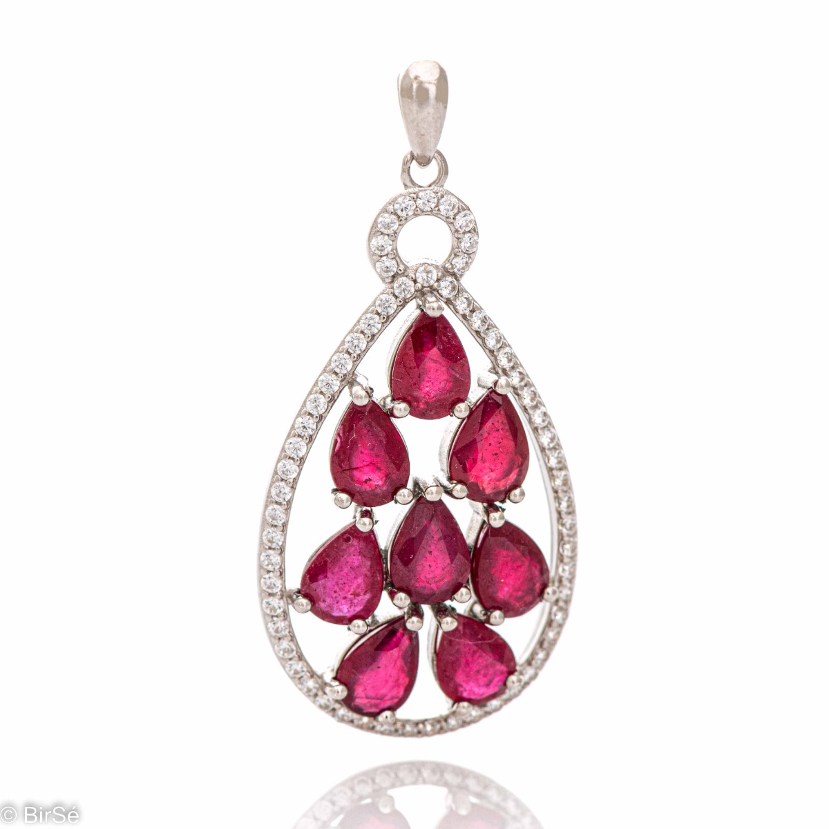 Изтънчена висулка с форма на капка, изработка от родирано сребро, естествени камъни рубин и циркони. Може да бъде съчетана с пръстен и обеци от същата колекция. Всички бижута с естествени камъни са придружени от специален сертификат, удостоверяващ автентичността им. На този сертификат можем да изпишем и лично послание за Вас или за когото е бижуто. Вижте още информация тук.