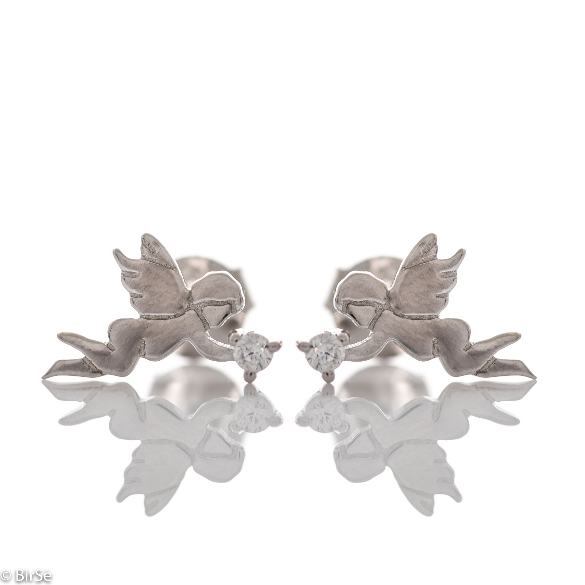Изключително нежни дамски обеци на щифт с малки и фини ангелчета, допълнени от бляскаво цирконче и изработка изцяло от родирано сребро. Подходящи за малки и големи дами.