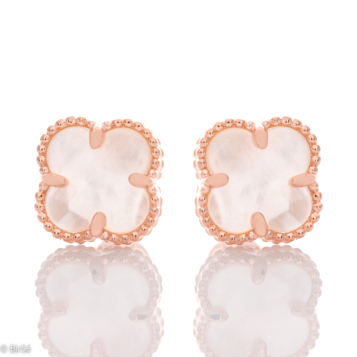Изключително елегантни дамски обеци флорален стил, изработени от розово сребро и пленителен седеф. Закопчаването е с щифт за по-голямо удобство, а с тези обеци ще се чувствате специално.