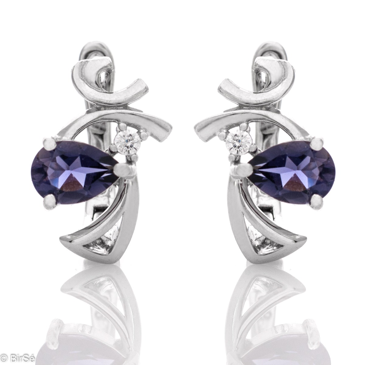 Изящни дамски обеци с английско закопчаване и ефектна изработка, преплитаща сияен естествен камък иолит с бляскав циркон и нежни изививки от родирано сребро. Прекресен подарък за любимата съпруга, майка или приятелка. Всички бижута с естествени камъни са придружени от специален сертификат, удостоверяващ автентичността им. На този сертификат можем да изпишем и лично послание за Вас или за когото е бижуто. Вижте още информация тук.
