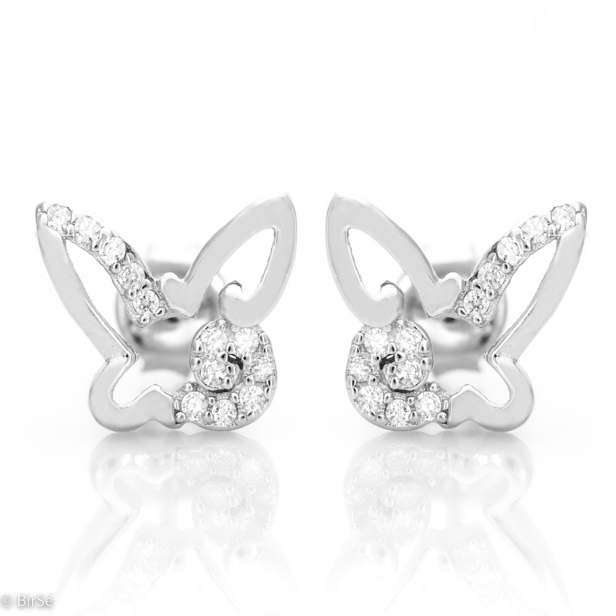 Изключително нежни сребърни обеци на щифт с фина изработка изцяло от родирано сребро, допълнено от бляскави циркони и изящна форма на пеперуда. Всички бижута са подаръчно опаковани и придружени от сертификат за качество и гаранция.