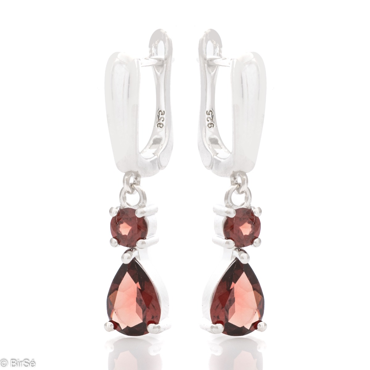 Изискани висящи обеци с английско закопчаване. Изящно излято сребро и величествен естествен гранат с капковидна форма. В комплект с пръстен и висулка със същия елегантен дизайн. Всички бижута с естествени камъни са придружени от специален сертификат, удостоверяващ автентичността им. На този сертификат можем да изпишем и лично послание за Вас или за когото е бижуто. Вижте още информация тук.