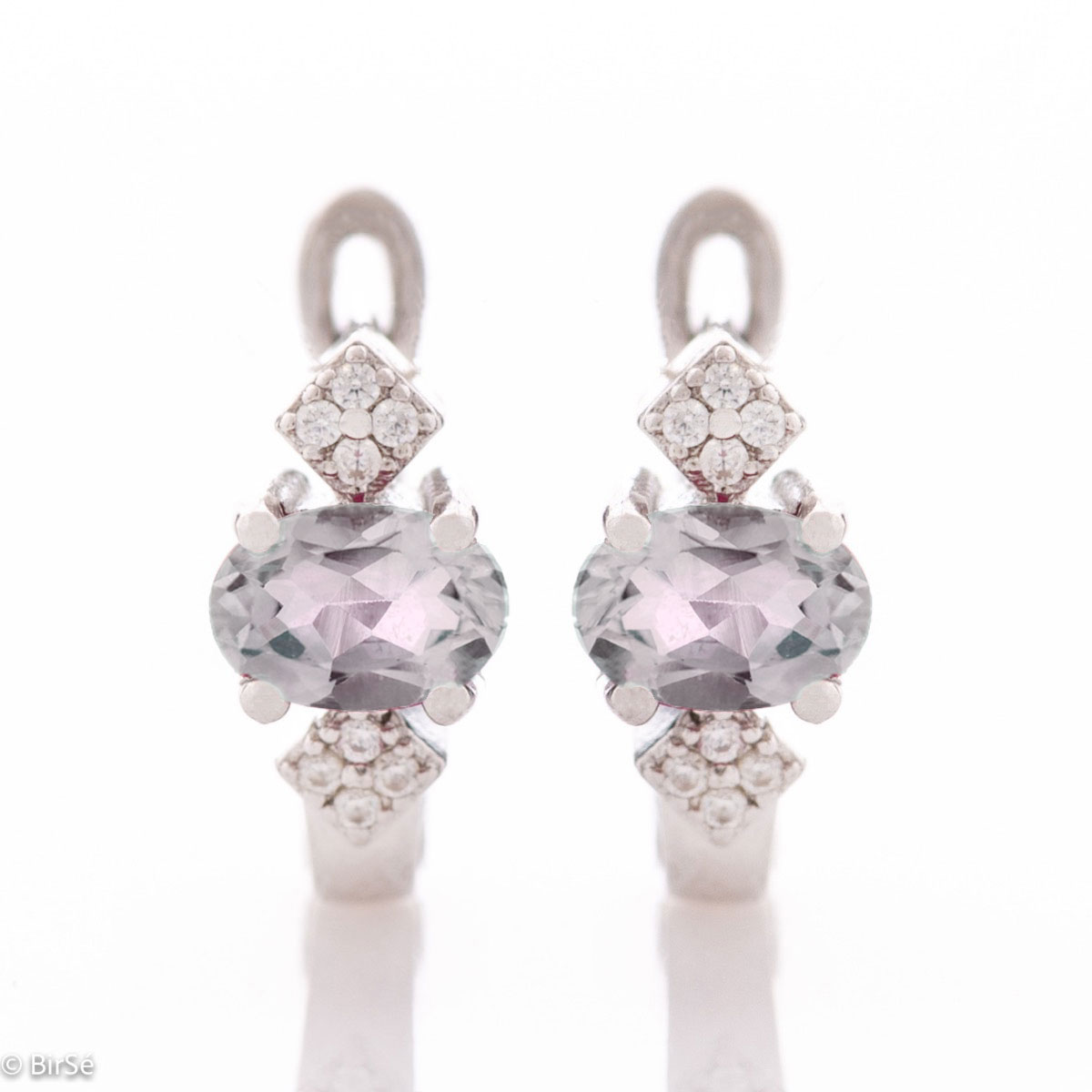 Фина изработка на дамски обеци с елегантно английско закопчаване от нежно родирано сребро. Цялата прелест на бижуто идва от изящния камък Мойсанит, красиво прихванат от среброто и съпроводен от блясък на циркони. Обеци, създадени за дами с изискан стил. Всички бижута с естествени камъни са придружени от специален сертификат, удостоверяващ автентичността им. На този сертификат можем да изпишем и лично послание за Вас или за когото е бижуто. Вижте още информация тук.