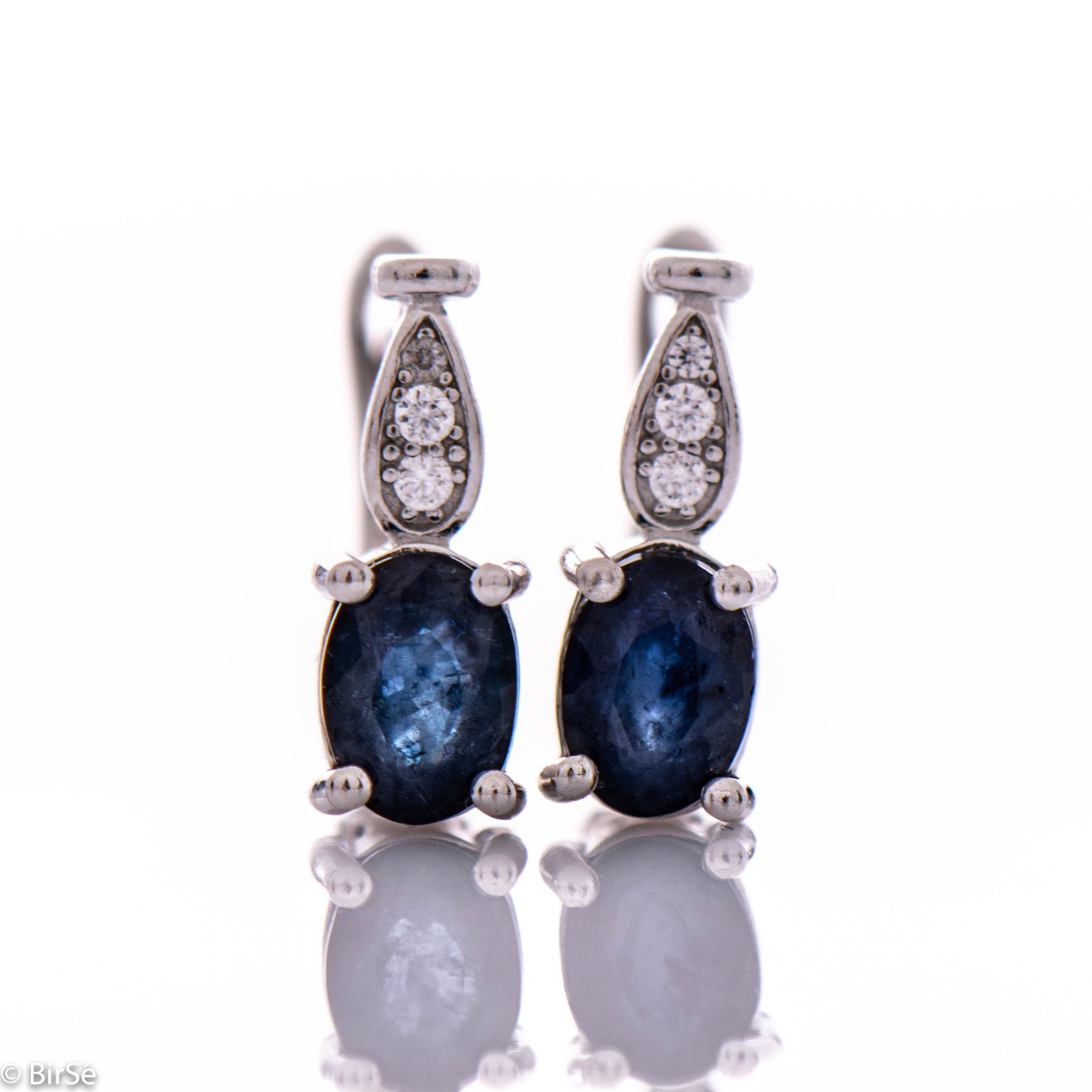 Фини дамски обеци с английско закопчаване и нежно преплитане на сияен естествен сапфир с бляскави циркони и изящна изработка от красиво родирано сребро. В изключителен комплект с пръстен и висулка. Всички бижута с естествени камъни са придружени от специален сертификат, удостоверяващ автентичността им. На този сертификат можем да изпишем и лично послание за Вас или за когото е бижуто. Вижте още информация тук.