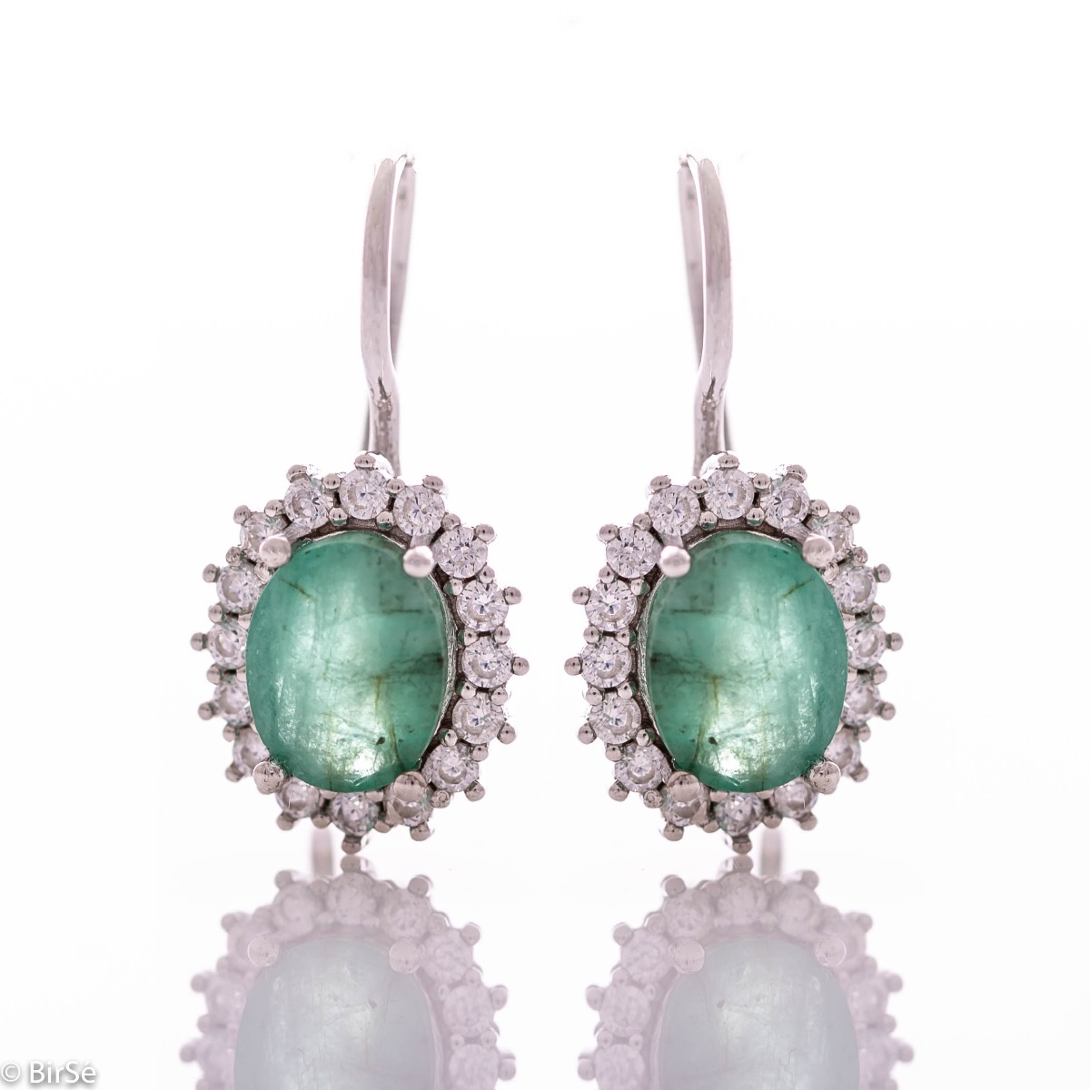 Изключителни дамски обеци с изящна изработка съчетаваща нежно родирано сребро със сияен естествен изумруд, обгърнат от бляскави циркони.Всички бижута с естествени камъни са придружени от специален сертификат, удостоверяващ автентичността им. На този сертификат можем да изпишем и лично послание за Вас или за когото е бижуто. Вижте още информация тук.