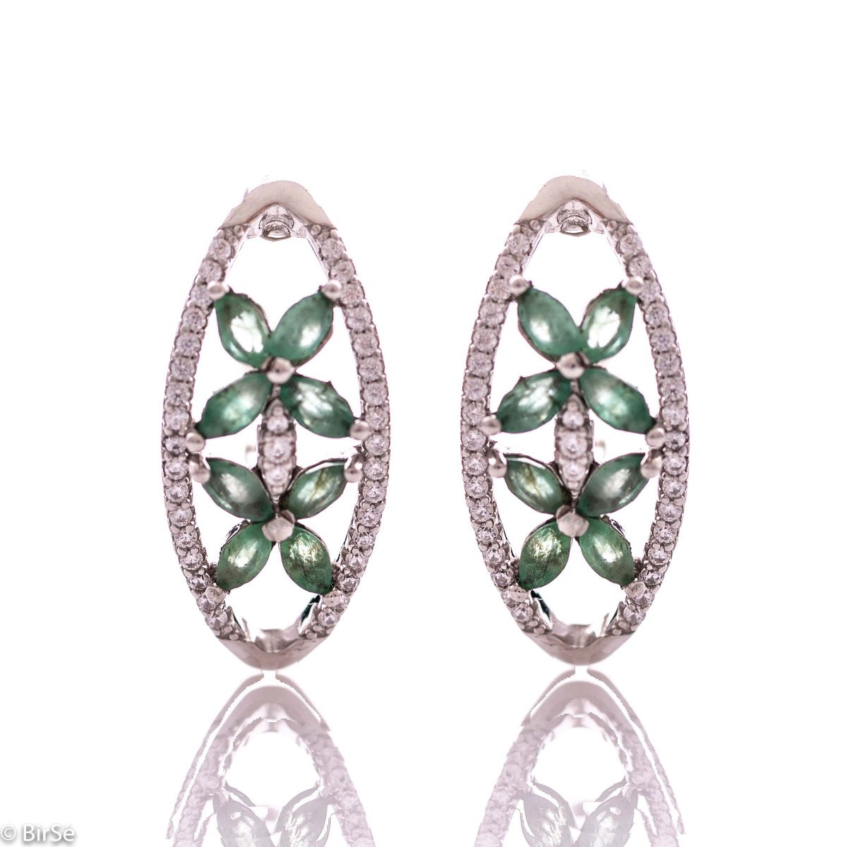 Ефектни дамски обеци с изящна изработка изцяло от родирано сребро, съчетано с нежни цветенца от естествен изумруд и бляскави циркони. Могат да се комбинират с пръстен и висулка от същия модел. Всички бижута с естествени камъни са придружени от специален сертификат, удостоверяващ автентичността им. На този сертификат можем да изпишем и лично послание за Вас или за когото е бижуто. Вижте още информация тук.