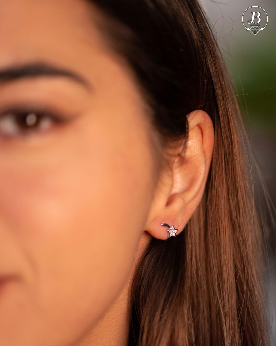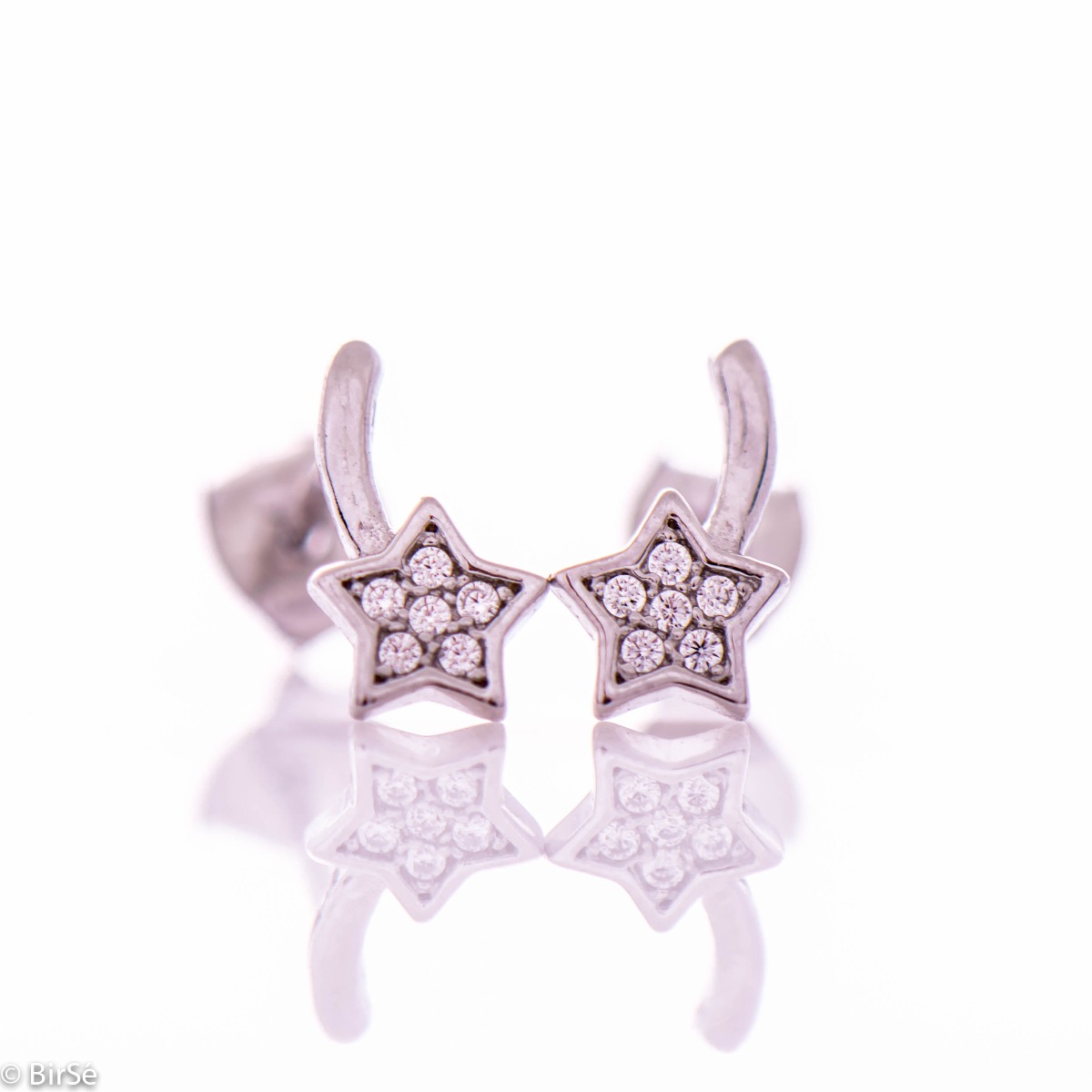 Изящни дамски обеци на щифт, с цялостна изработка от фино родирано сребро и форма на падаща звезда. Добавените циркони превръщат обеците в ослепително бижу, любимо за малки и големи дами.