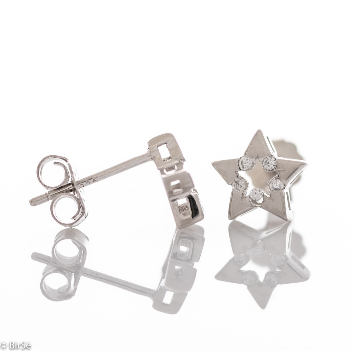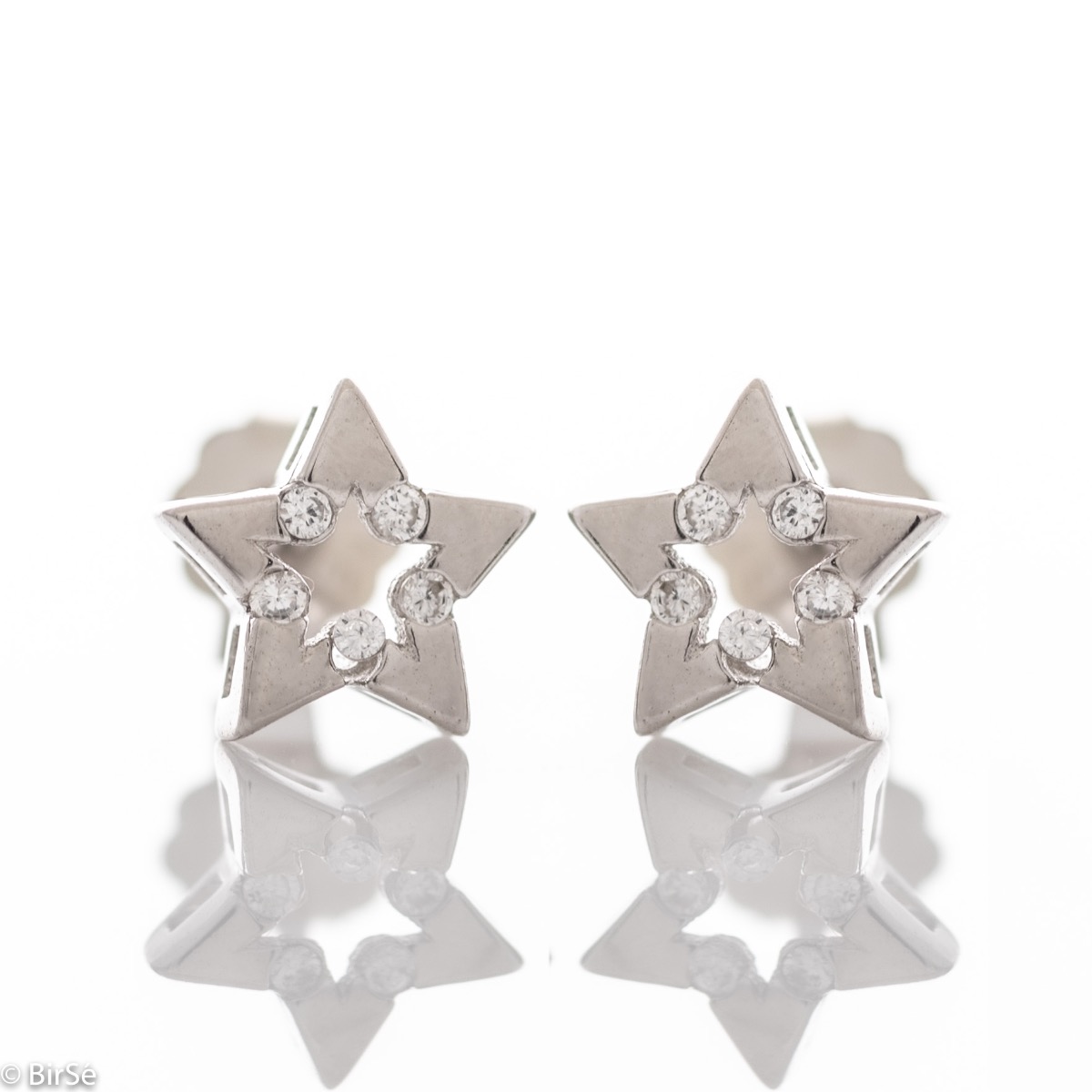 Изключително фини сребърни обеци на щифт, във форма на малки звездички, изработени изцяло от бляскаво родирано сребро, допълнено от циркони. Всички бижута са подаръчно опаковани и придружени от сертификат за качество и гаранция.