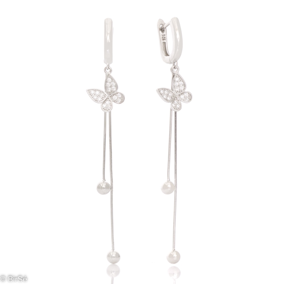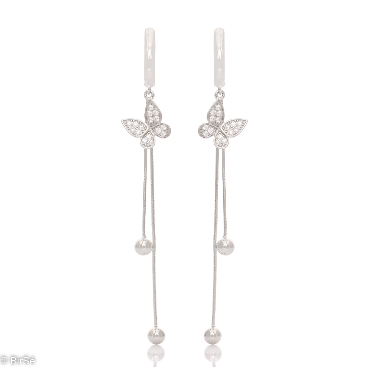 Изящни висящи обеци за дами, харесващи бижута с пеперуди. Изработени от елегантно родирано сребро пеперуди красиво пробляскват от цирконите, които ги украсяват. А фини верижки с топчета в края, завършват дизайна и придават допълнителен чар.