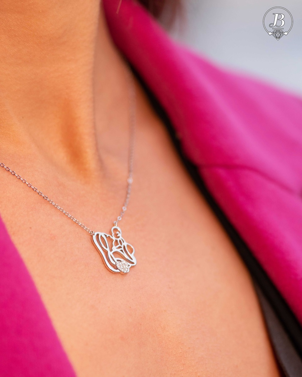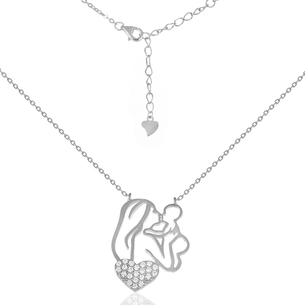 Сребърно колие -" Мама и Бебе" е едно изящно бижу, изработено с много любов и майсторство от красиво родирано сребро. Сърце, изцяло украсено с циркони, дава допълнителен блясък на колието. Подходящ подарък за родилки или за кръщене на дете.