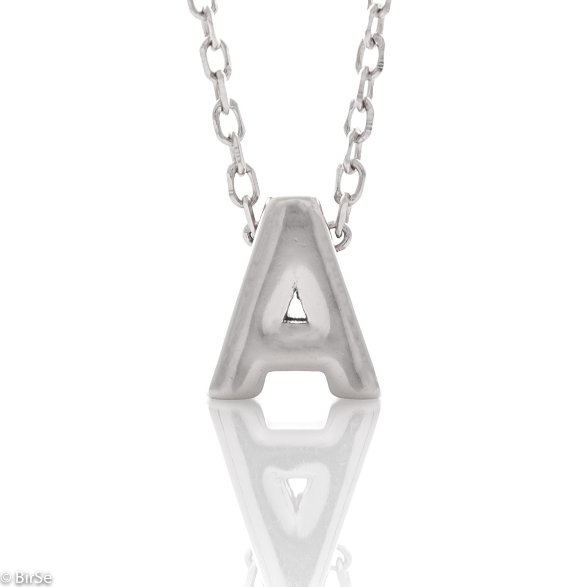Изтънчена изработка на дамско колие от блестящо родирано сребро с буква А. Нежно и ефектно бижу, семпло и умело съчетаващо се с всякакви бижута от родирано сребро.