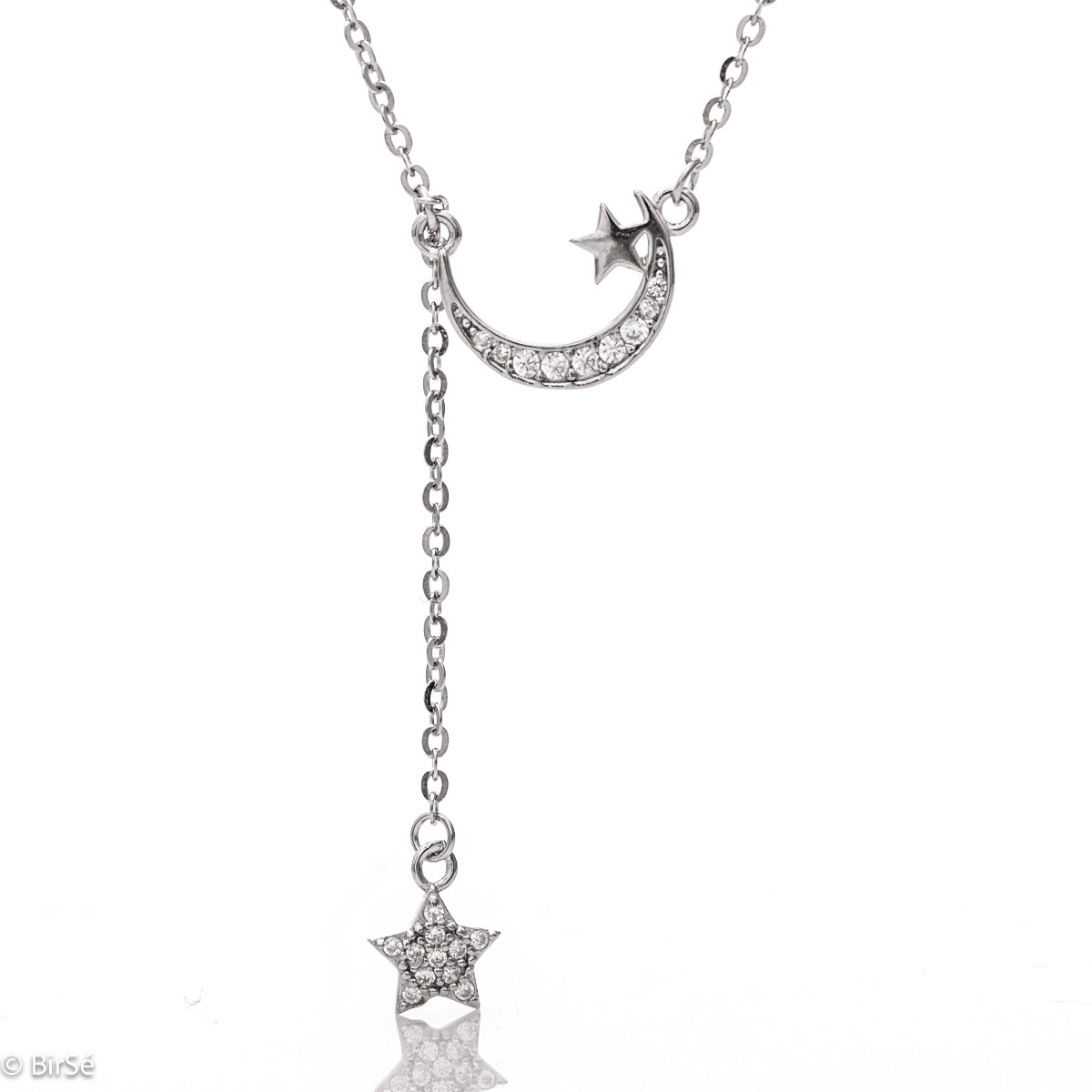 Неописуемата небесна красота събрана в нежно колие от родирано сребро, с майсторски оформени елементи, ефектно съчетани с омагьосващия блясък на цирконите. Полетете сред звездите с новото бижу от BirSe.