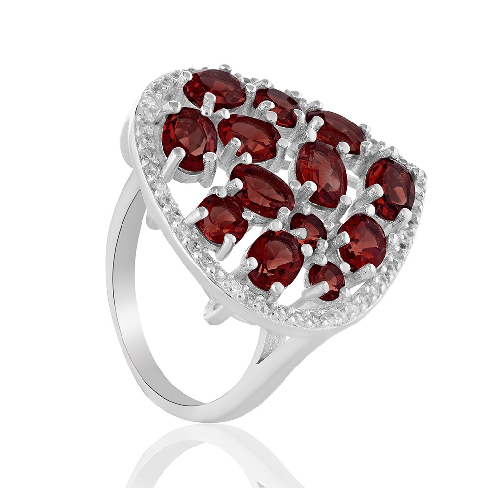 Впечатляващ пръстен от благородно сребро, инкрустиран с подбрани естествени гранати в дълбок червен нюанс, обкръжени от сияещи бели циркони. Перфектен избор за жени, които ценят страстта, силата и неподражаемата елегантност на скъпоценните камъни.