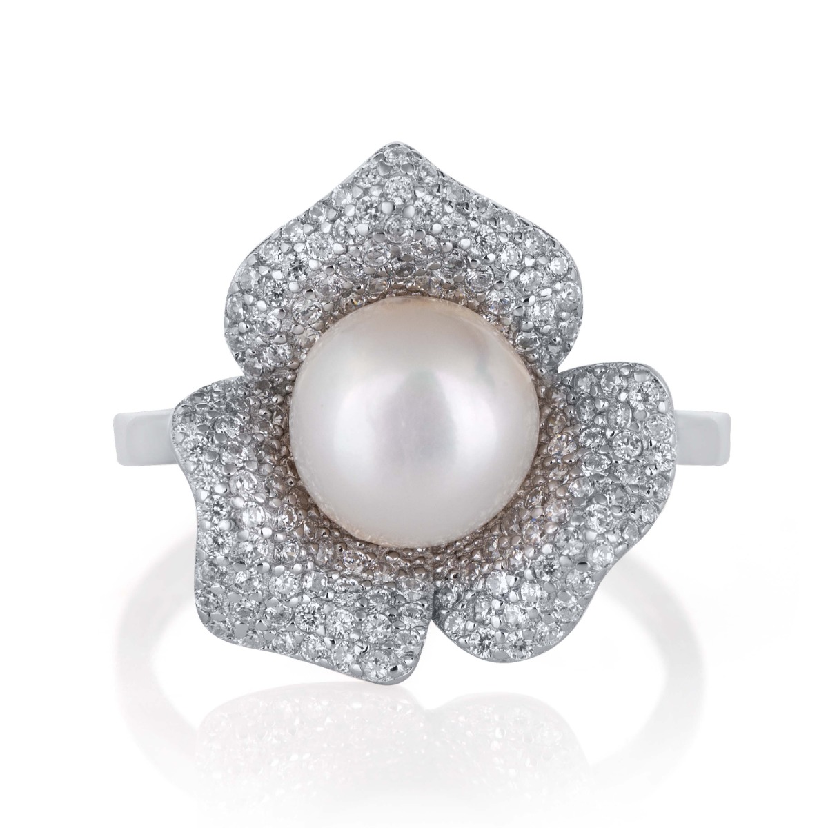 Очарователен пръстен във формата на разцъфнало цвете, изработен от сребро 925. В центъра блести естествена бяла перла с диаметър 8,5 мм, обградена от фино инкрустирани циркони, които придават изключителен блясък и елегантност. Нежната комбинация между перла и циркони създава усещане за лукс и женственост.