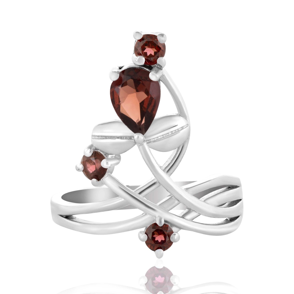 Деликатен пръстен от родирано сребро с фини преплетени линии, украсен с четири граната — три кръгли и един капковиден, оформящ пъпка на цвете. Символ на страст, енергия и вярност, този пръстен е идеален акцент към елегантна визия.