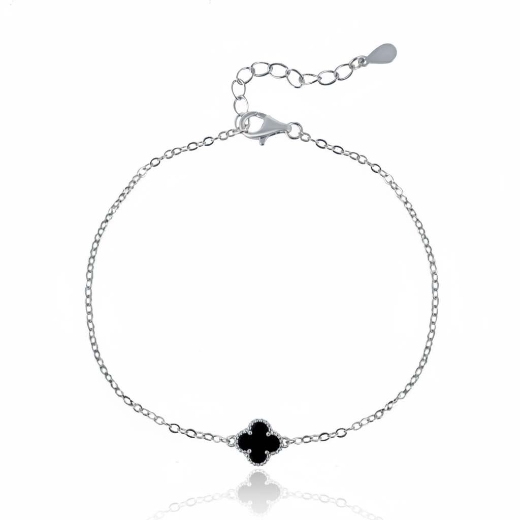 Изчистена и стилна, тази сребърна гривна впечатлява с фина детелина от черен оникс — камък, символ на сила и защита. Контрастът между дълбокото черно и блясъка на родираното сребро създава модерна визия, подходяща както за ежедневието, така и за по-елегантни поводи.