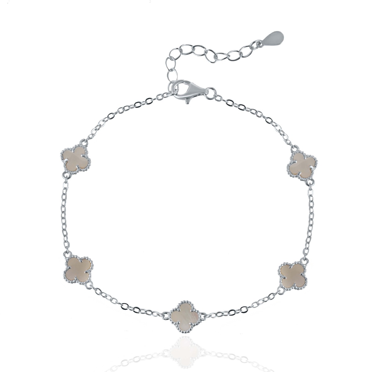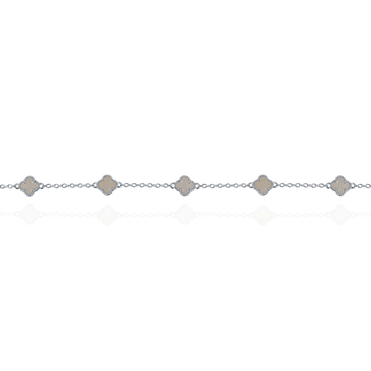 Сребърната гривна „Пет детелини“ със седеф впечатлява с нежен дизайн и изискан блясък. Фината верижка е украсена с детелини от естествен седеф, които придават елегантност и романтично излъчване. Стилен аксесоар, подходящ както за ежедневието, така и за специални поводи.
