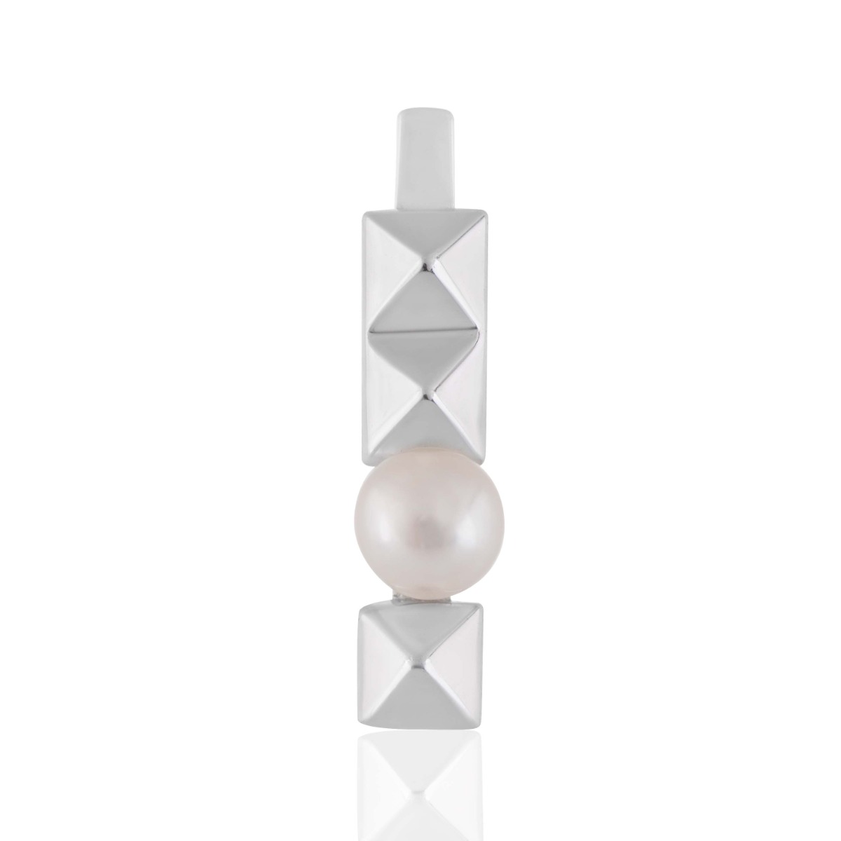 Стилна и модерна висулка, вдъхновена от геометричните форми. Изработена от сребро, тя съчетава изчистената визия на пирамидален дизайн с нежността на овална бяла перла с диаметър 4 мм. Перфектно бижу за съвременна жена, която обича елегантността с артистичен акцент.