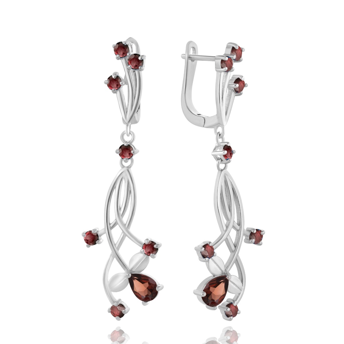 Тези обици от родирано сребро впечатляват с фината си изработка, вдъхновена от природата – нежни флорални мотиви и преплетени линии създават усещане за хармония и движение. Дизайнът е изискано допълнен от естествени гранати в кръгли и капковидни форми, които носят наситен виненочервен цвят и придават дълбочина и топлина на цялостната визия. Английското закопчаване осигурява комфорт и надеждност, докато свободното висящо оформление на обиците подчертава тяхната елегантност и грация при всяко движение. Идеален избор за дами с усет към класическата красота с модерен прочит.