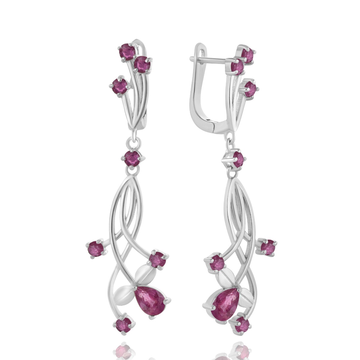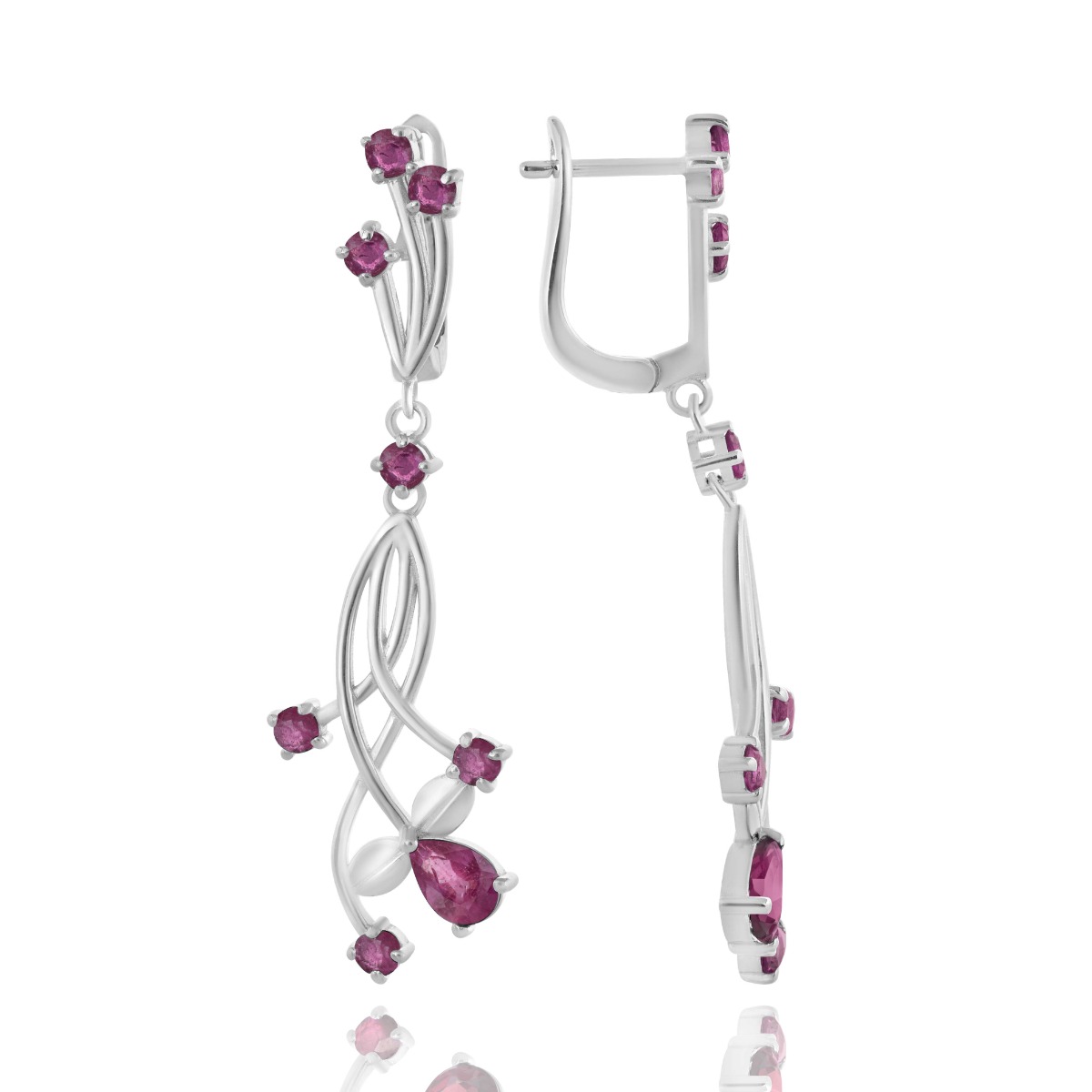 Тези обици от родирано сребро съчетават елегантност и изтънченост чрез красиви флорални мотиви и нежно преплетени линии, които придават усещане за движение и лекота. Въздействащият дизайн се допълва от изящни рубини, разположени в кръгли и капковидни форми, които добавят интензивен, но изтънчен цвят и блясък. Английското закопчаване осигурява удобство и стабилност, докато самите обици висят свободно, придавайки женственост и загадъчност на всяко движение.