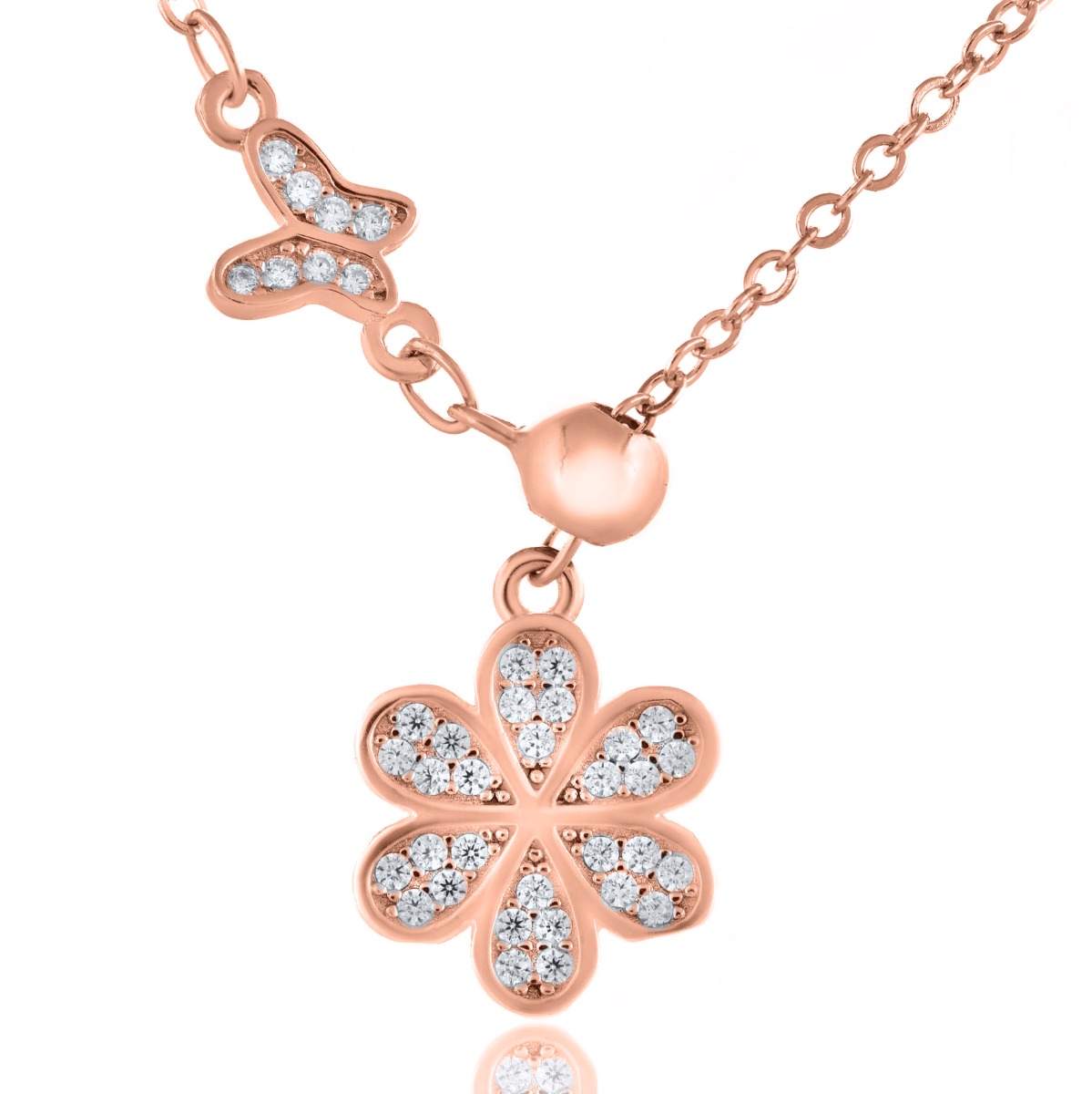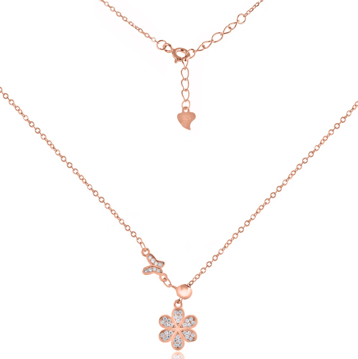 Това изящно сребърно колие съчетава две от най-красивите природни символики – цвете и пеперуда. Деликатният дизайн е украсен с бляскави циркони, които придават нежност и елегантност на бижуто. Изработено от висококачествено сребро, това колие е перфектният аксесоар за романтични души и любители на природните мотиви. Подходящо както за ежедневието, така и за специални поводи, то ще внесе изтънченост и чар във всяка визия.