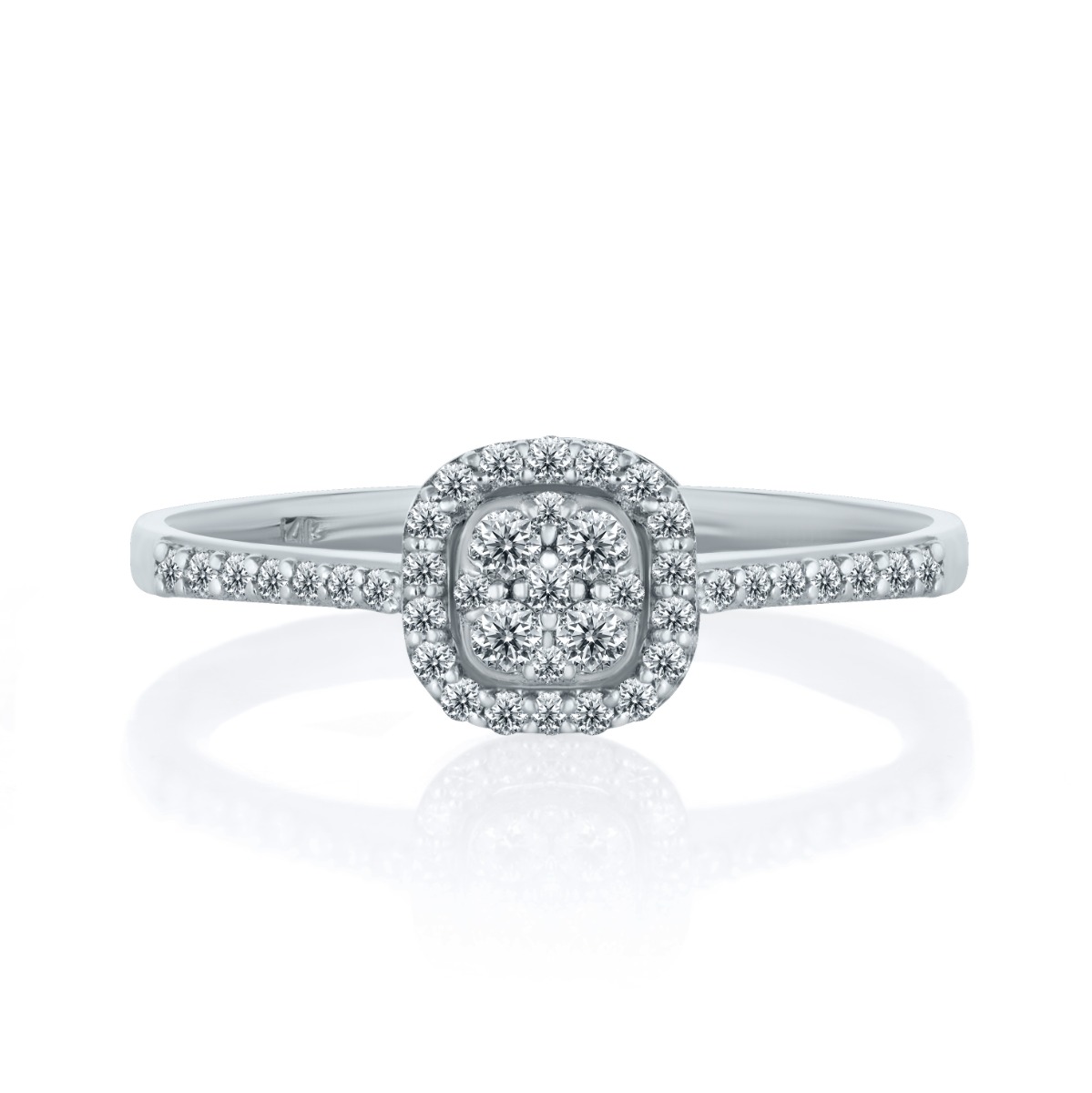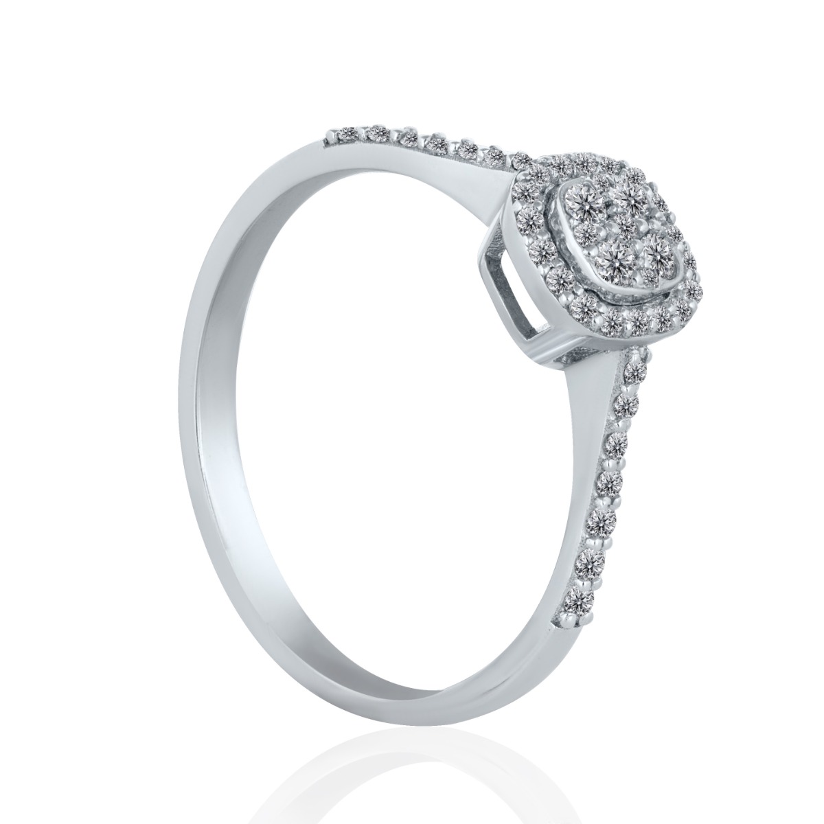 Очарователно изкушение, под формата на годежен пръстен от елегантно бяло 14 к злато. Върху фина халка е поставена нежна корона от диамантчета, обгърнала ослепителен диамант. Част от халката също блести с диамантен чар. Бижу, създадено без думи да казва това, което нашепва влюбеното сърце.