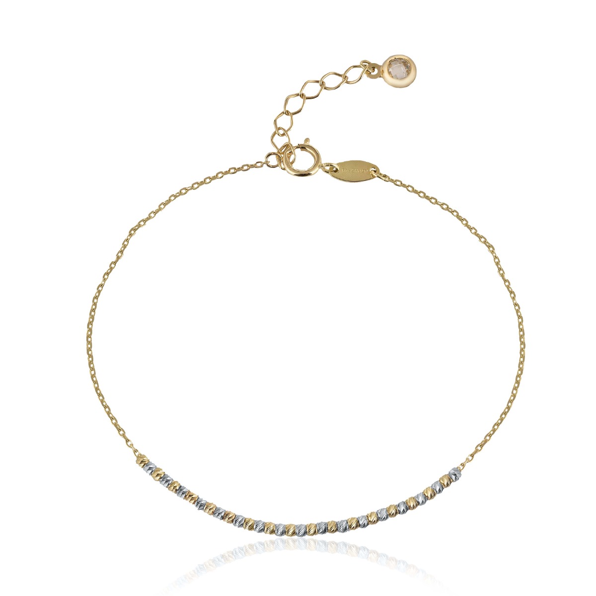 Добавете фин блясък към визията си с тази елегантна златна гривна, изработена от висококачествено 14-каратово злато. Деликатната верижка е допълнена с фино оформени бели и жълти топчета, които улавят светлината и придават изискан, модерен акцент.