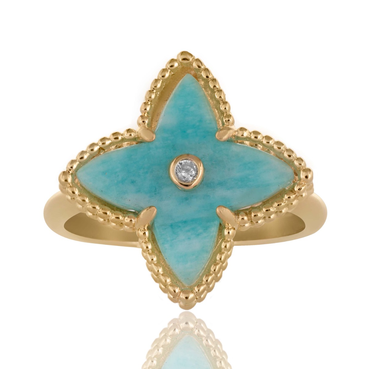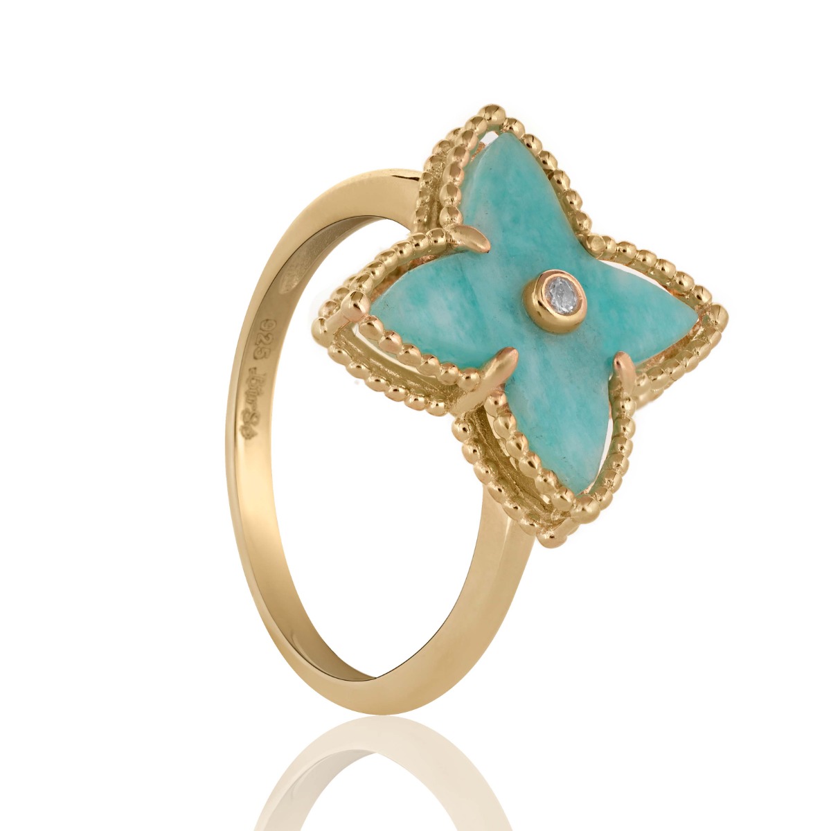 Изящен дамски пръстен с пленяващо съчетание на естествен камък амазонит в красива форма на цвете и изработка изцяло от жълто сребро. Всички бижута с естествени камъни са придружени от специален сертификат, удостоверяващ автентичността им. На този сертификат можем да изпишем и лично послание за Вас или за когото е бижуто. Вижте още информация тук.