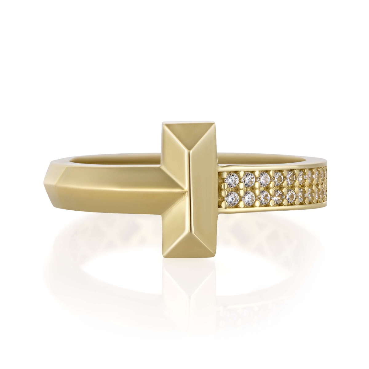 Уникален златен пръстен от 14-каратово жълто злато с модерен геометричен дизайн и ефектен централен елемент. Едната страна е декорирана с ред бляскави циркони, които придават изискан блясък и луксозно излъчване. Моделът впечатлява с изчистени линии и стилна визия, подходящ както за ежедневието, така и за специални поводи.