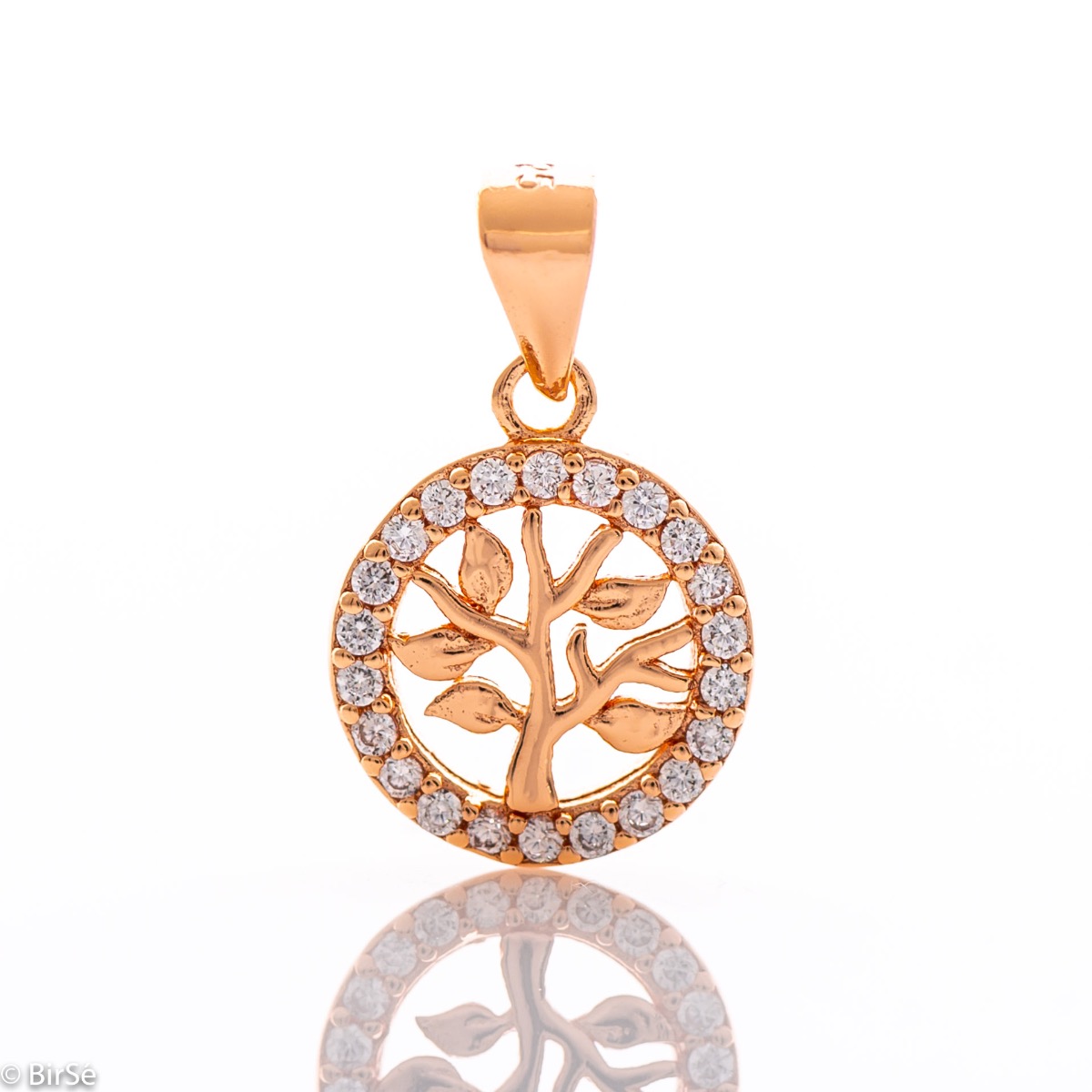 Фина дамска висулка с изящна форма на дървото на живота, обгърнато от бляскави циркони и изработка изцяло от нежно родирано розово сребро. Може да се комбинира с обеци от същия модел.